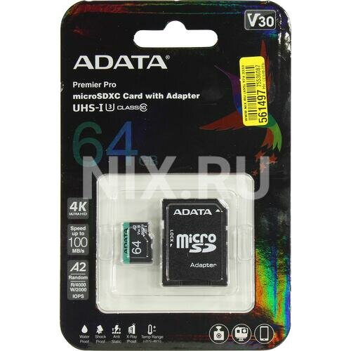 Карта памяти microSDXC UHS-I U3 A-Data Premier Pro 64 ГБ, 100 МБ/с, Class 10, AUSDX64GUI3V30SA2-RA1, 1 шт., переходник SD 990 ₽