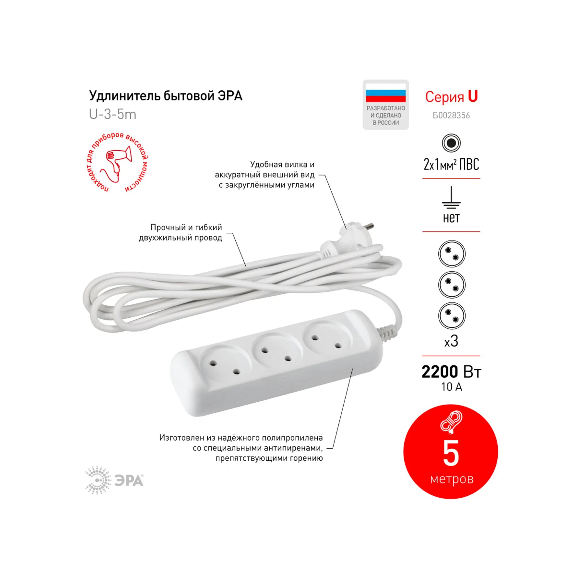 U-3-5M-2X1 Удлинитель Без Зазeмл., 3Гн, 5М, Пвс, 2Х1мм2, 10А ЭРА арт. Б0028356
