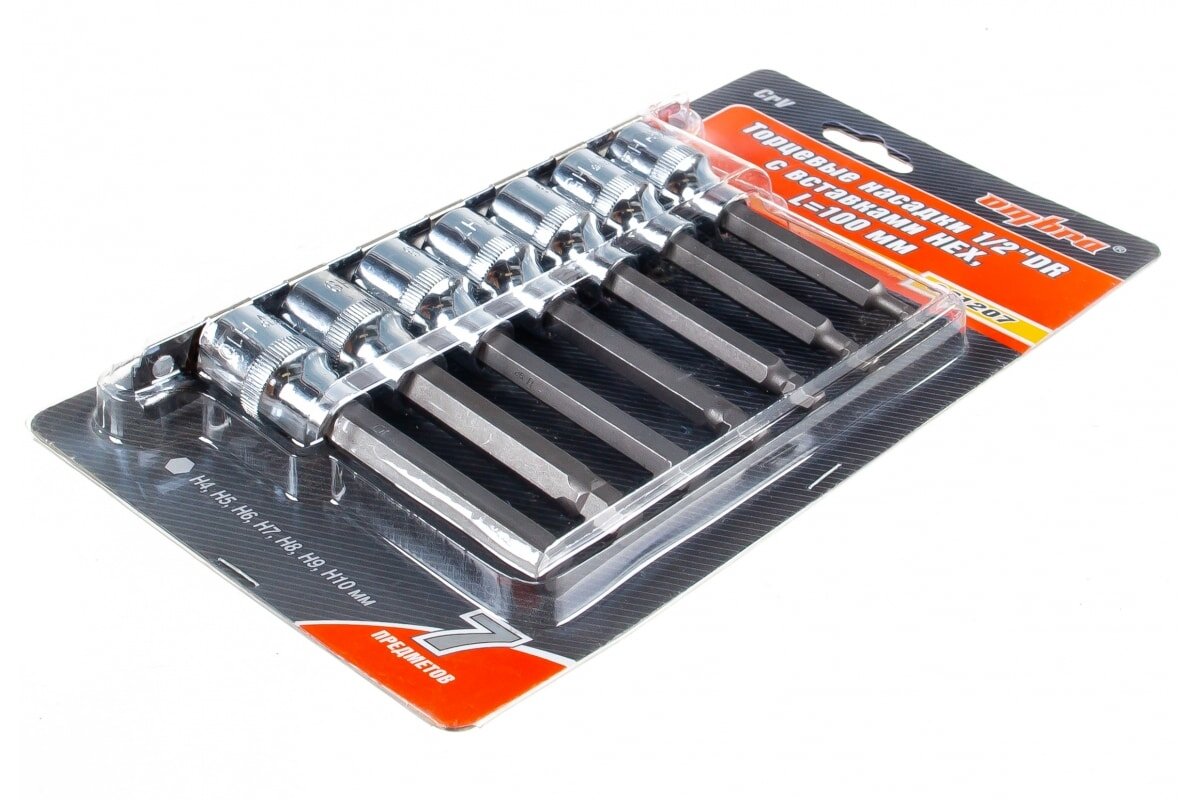 10 цен на Набор насадок торцевых 1/2"DR с вставками-битами шестигранными на дрежателе, H4-H10, 100 мм, 7 предметов Ombra 921207