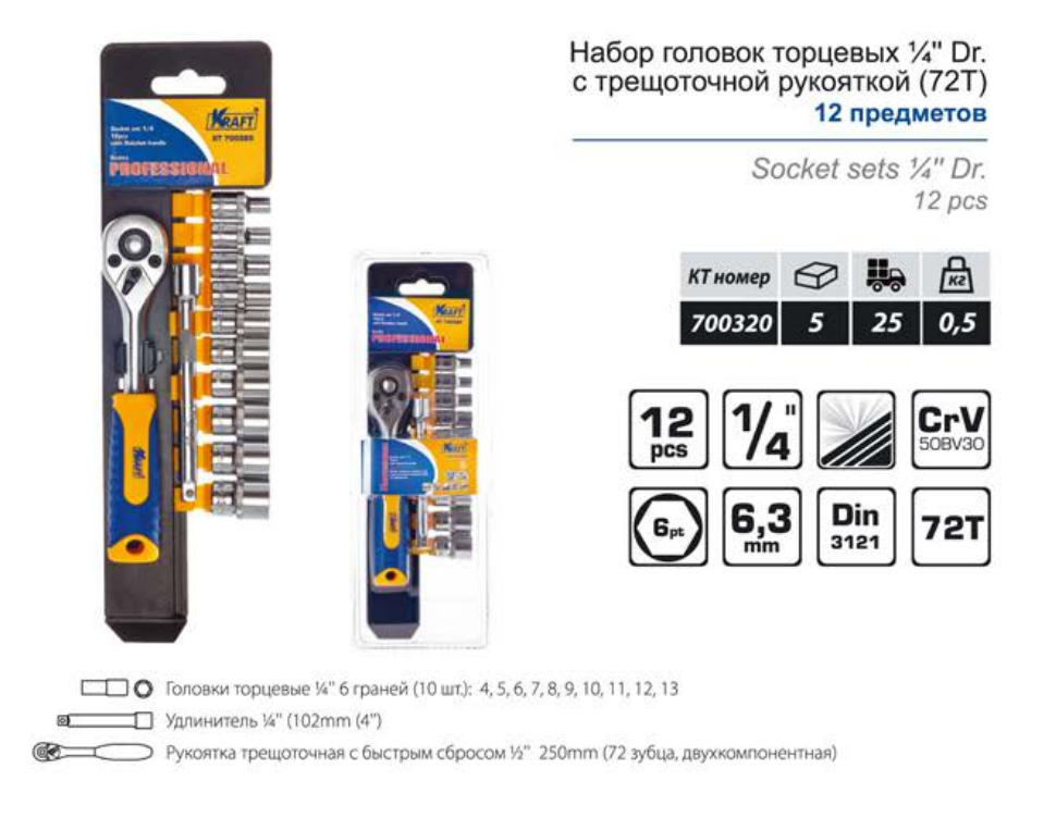 Набор Инструмента 12 Предм. (1/4) (Tool) Kraft арт. KT700320 информация: