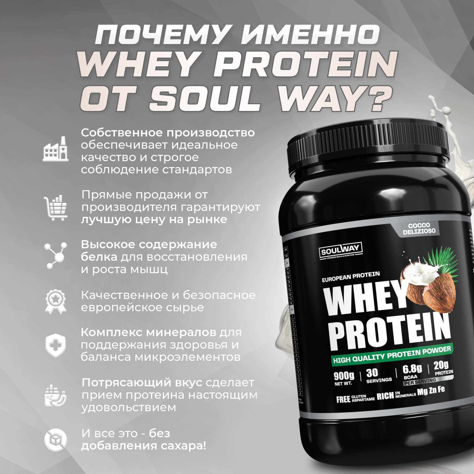 Протеин сывороточный Soul Way, кокосовый / 900 гр 30 порций информация: