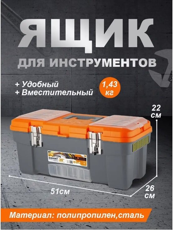 "Blocker" Контейнер-ящик для инструментов пластмассовый "Expert" 55,7х28,4х23,6см, металлические замки, серо-свинцовый/оранжевый (Россия)