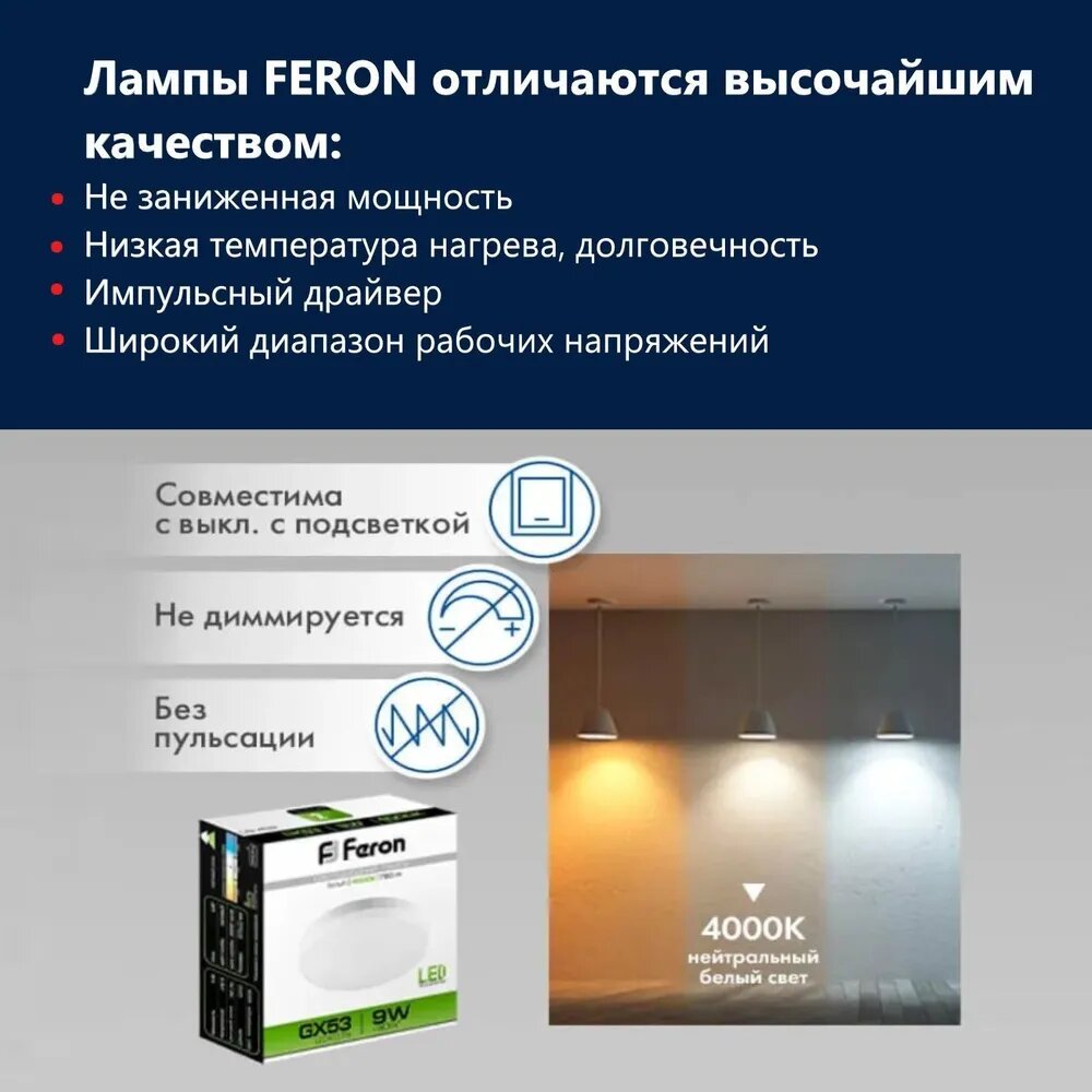 Отзывы на Светодиодная LED лампа Feron GX53 9W(760lm) 4000K 4K 24x75 матовая LB-452 25829 (упаковка 10 штук)