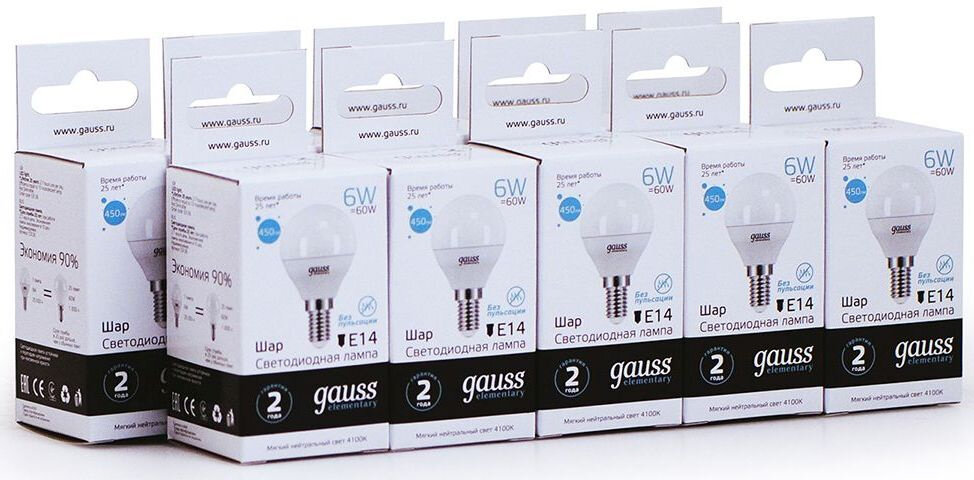Отзывы на Лампа светодиодная Gauss Elementary 6Вт цок.:E14 шар 220B 4100K св.свеч.бел.нейт. (упак.:10шт) (5312