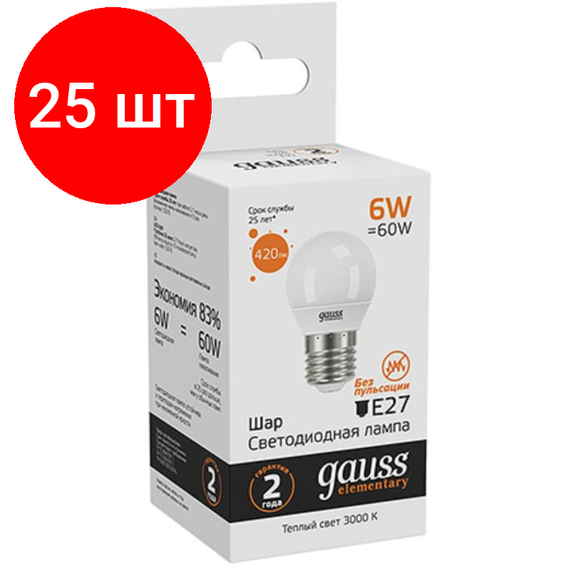Комплект 25 штук, Лампа светодиодная Gauss LED Elementary Шар 6Вт E27 420Лм 3000K (53216) информация: