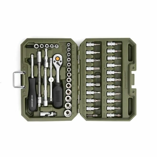 | Головки торцевые подробно | 1/2": 8, 9, 10, 11, 12, 13, 14, 15, 16, 17, 18, 19, 21, 22, 24, 27, 30, 32 мм; свечные 1/2": 16, 21 мм; вороток т-образный 1/2": 250 мм; трещотка 1/2": 45 зубов; вороток с шарниром 1/2": 380 мм; удлинитель 1/2": 125, 250 мм; карданный шарнир 1/2" |