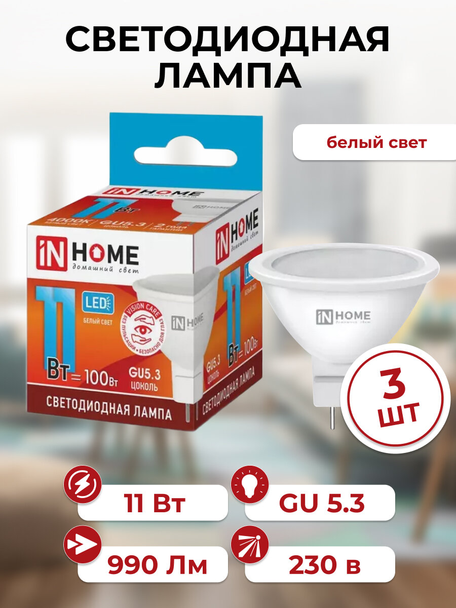 10 цен на Лампа светодиодная GU5.3, набор 3шт, нейтральный белый свет 4000К, 990 Лм / 11 Вт, 230 В, IN HOME LED-JCDR-VC