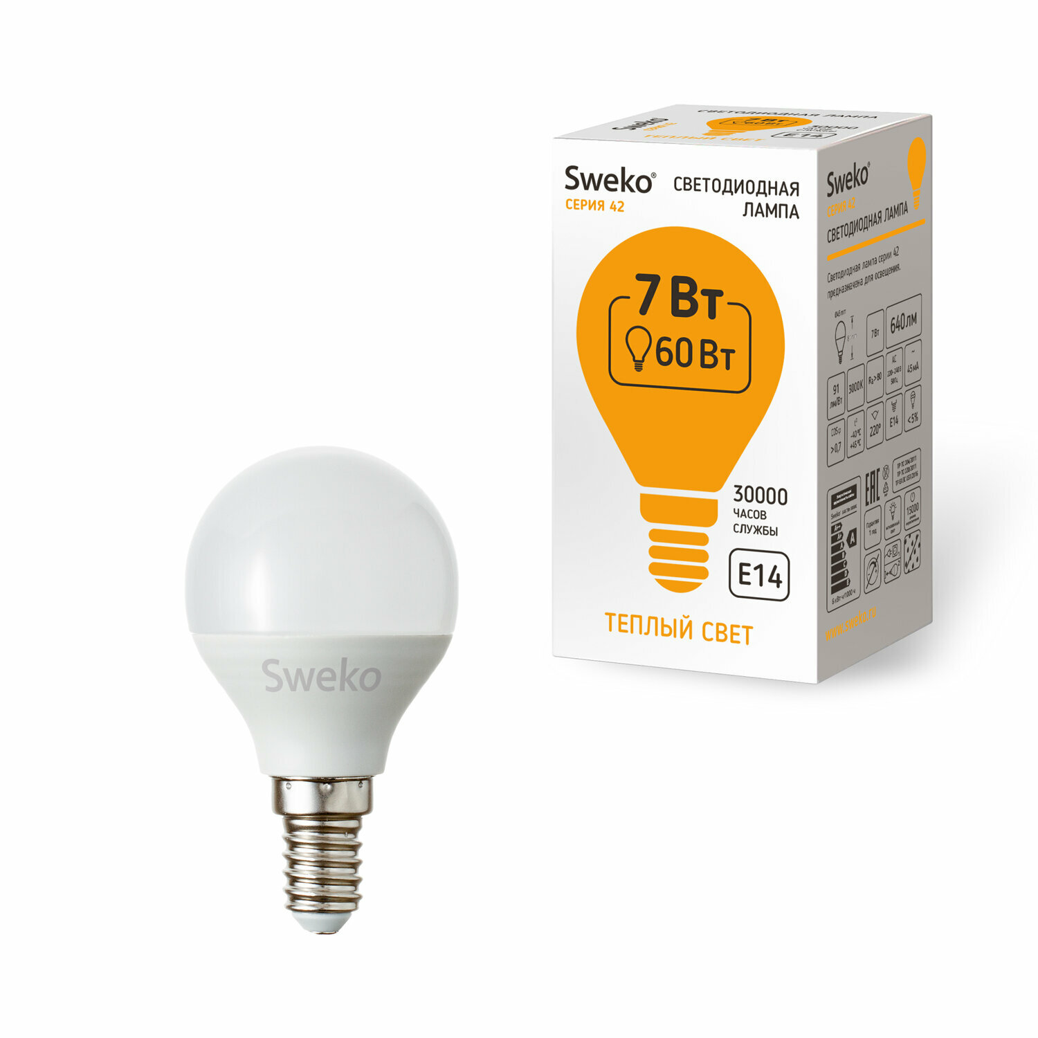 Комплект из 5 штук. Sweko Светодиодная лампа Шар матов G45 E14 7W(640lm) 3000K 81х45 информация: