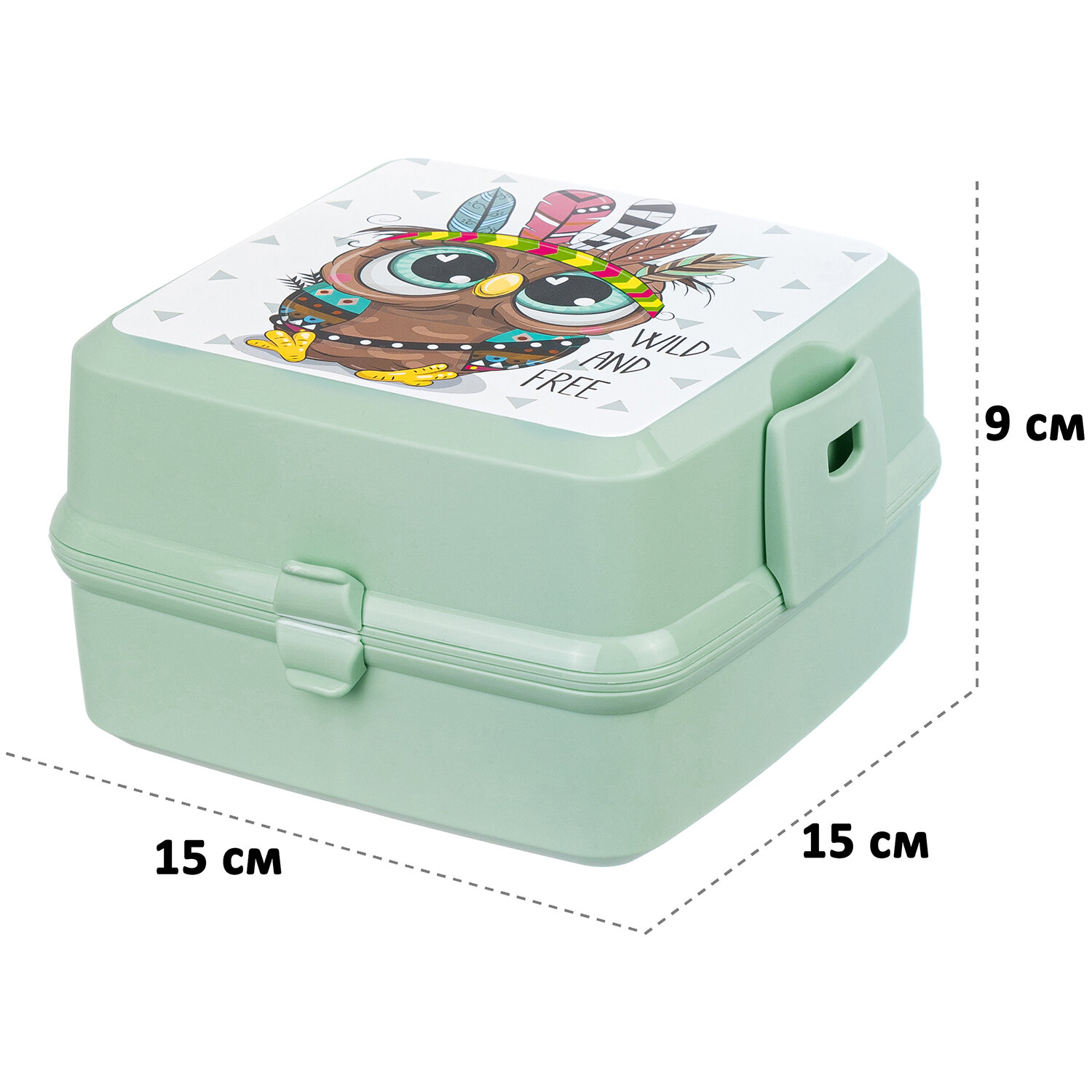 Ланч-бокс 1,2 л 15х15х9 см Бенто Сова в перьях, фисташковый, с вилкой и ложкой