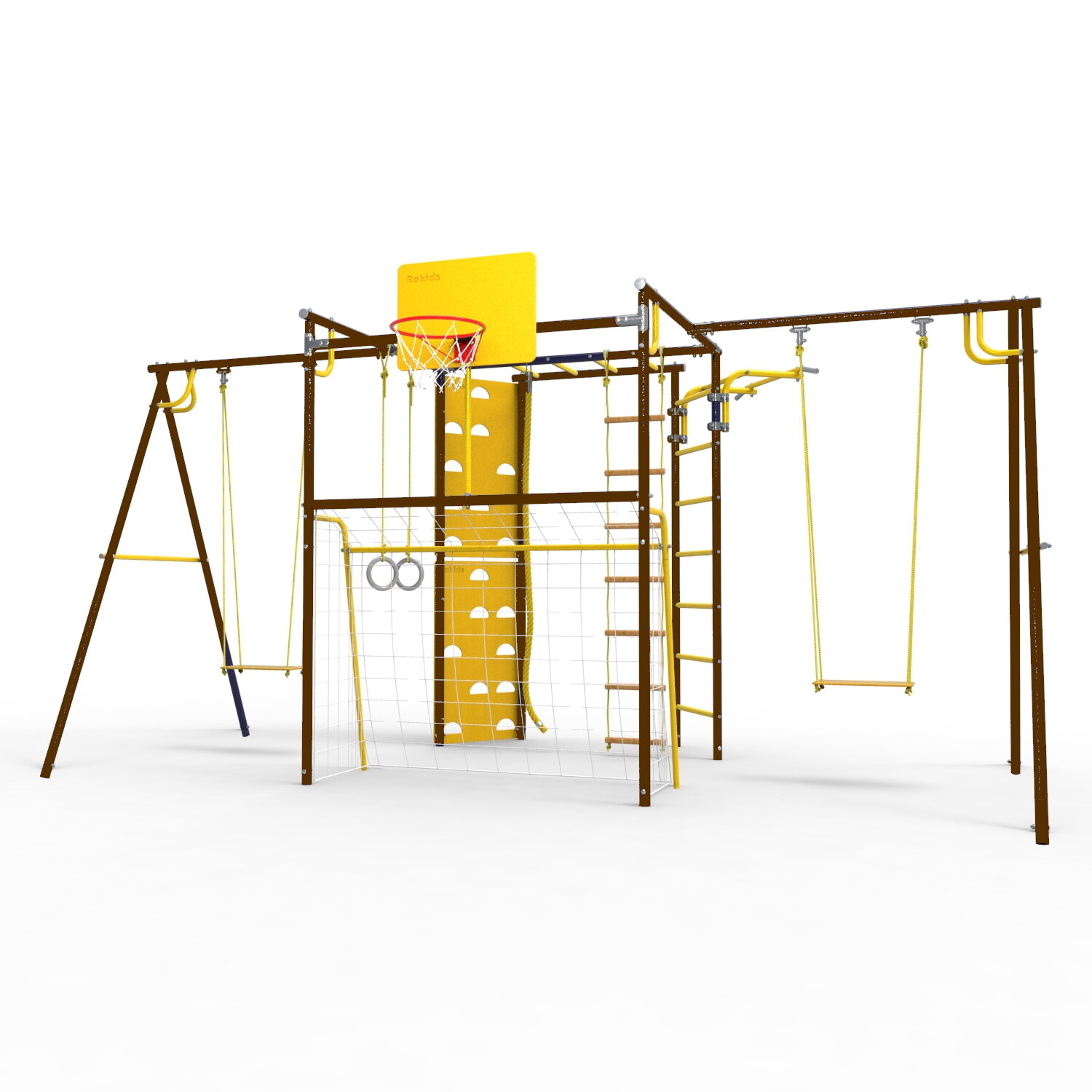 | Комплектация | рукоход, турник регулируемый, футбольные ворота, качели плоские, скалодром, кольцо баскетбольное, кольца гимнастические, канат, лестница веревочная, закладные для бетонирования |