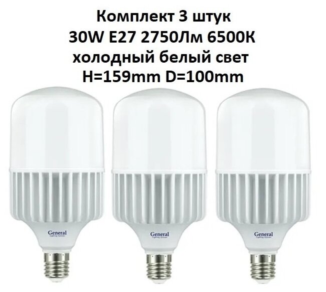 General, Лампа светодиодная, Комплект из 3 шт., 30 Вт, Цоколь E27, 6500К, Форма лампы Бочонок