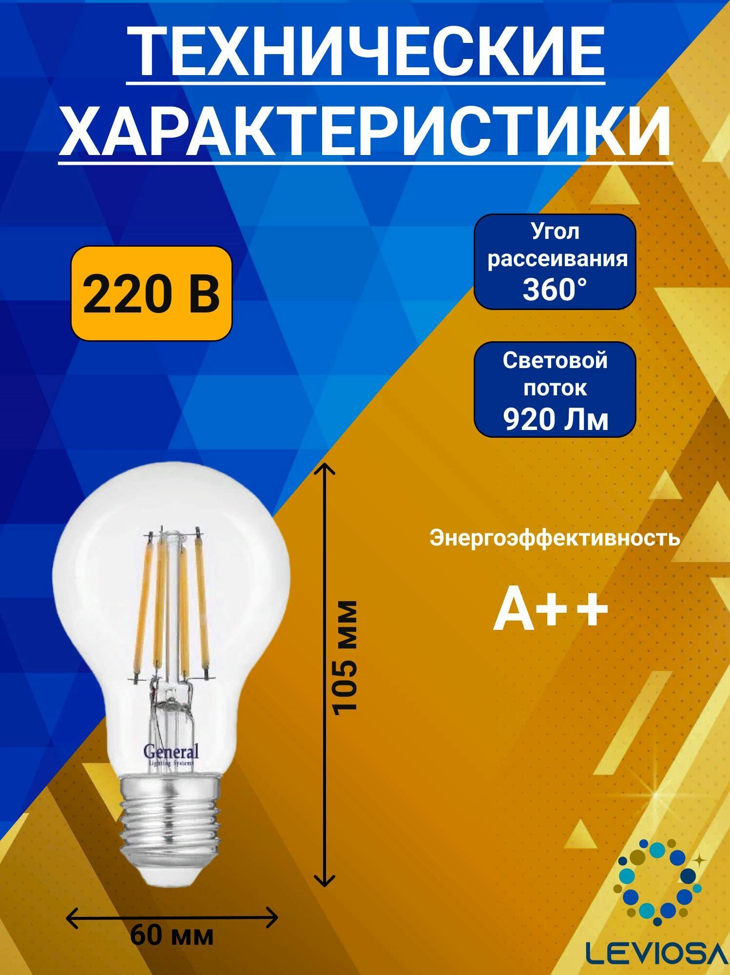 Светодиодные лампы филаментная, General, Комплект из 3 шт, Мощность 10 Вт, Цоколь E27, Теплый свет