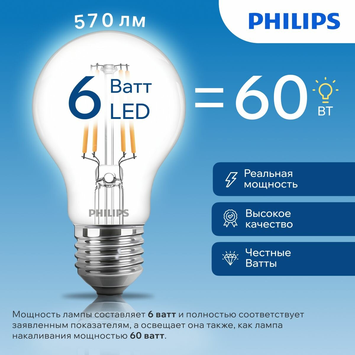 Отзывы на Светодиодная лампочка Philips E27 6 Ватт холодная свет, груша 6500К филаментная 570лм A60 LEDClassic 6W 865