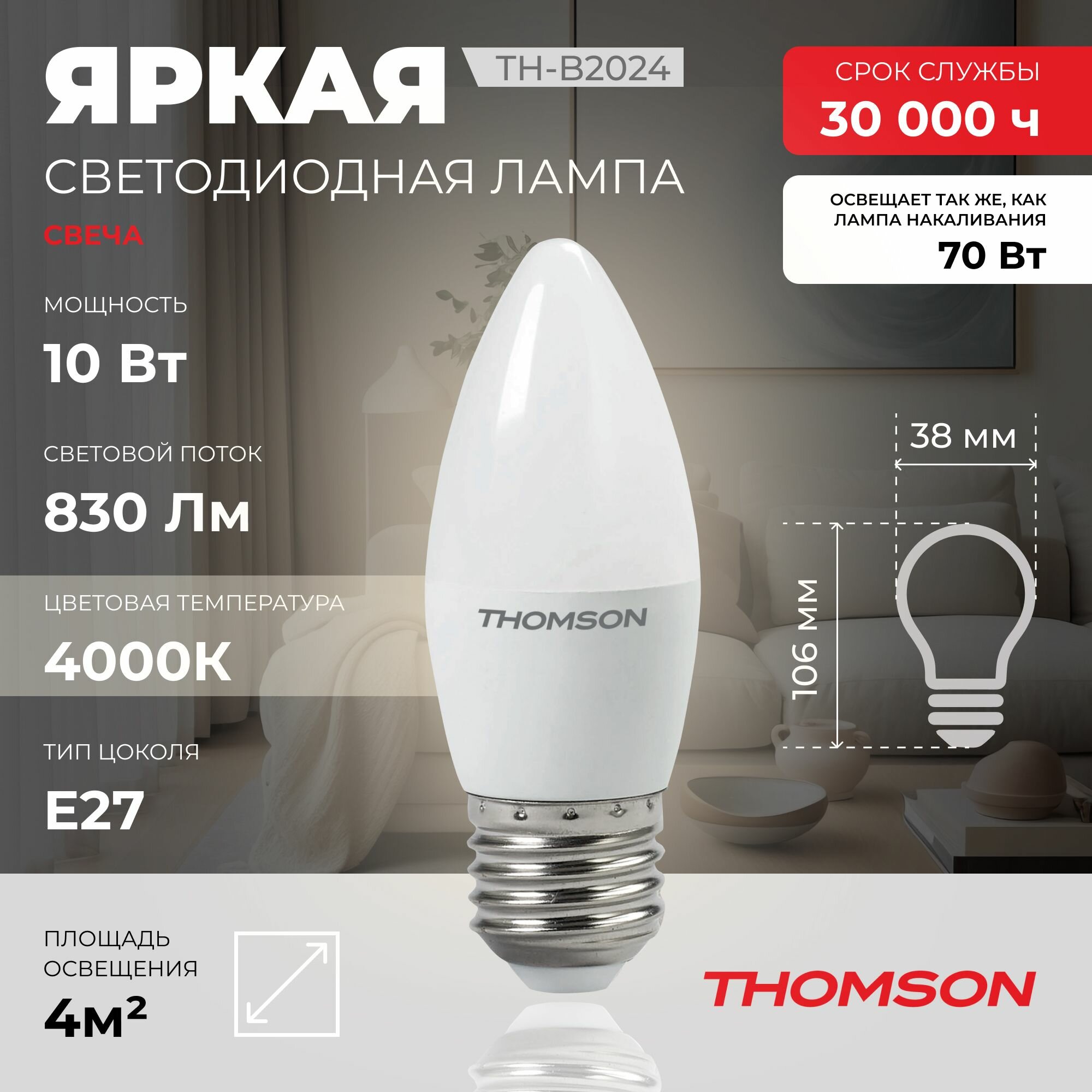 Лампочка Thomson TH-B2024 10 Вт, E27, 4000K, свеча, нейтральный белый свет информация: