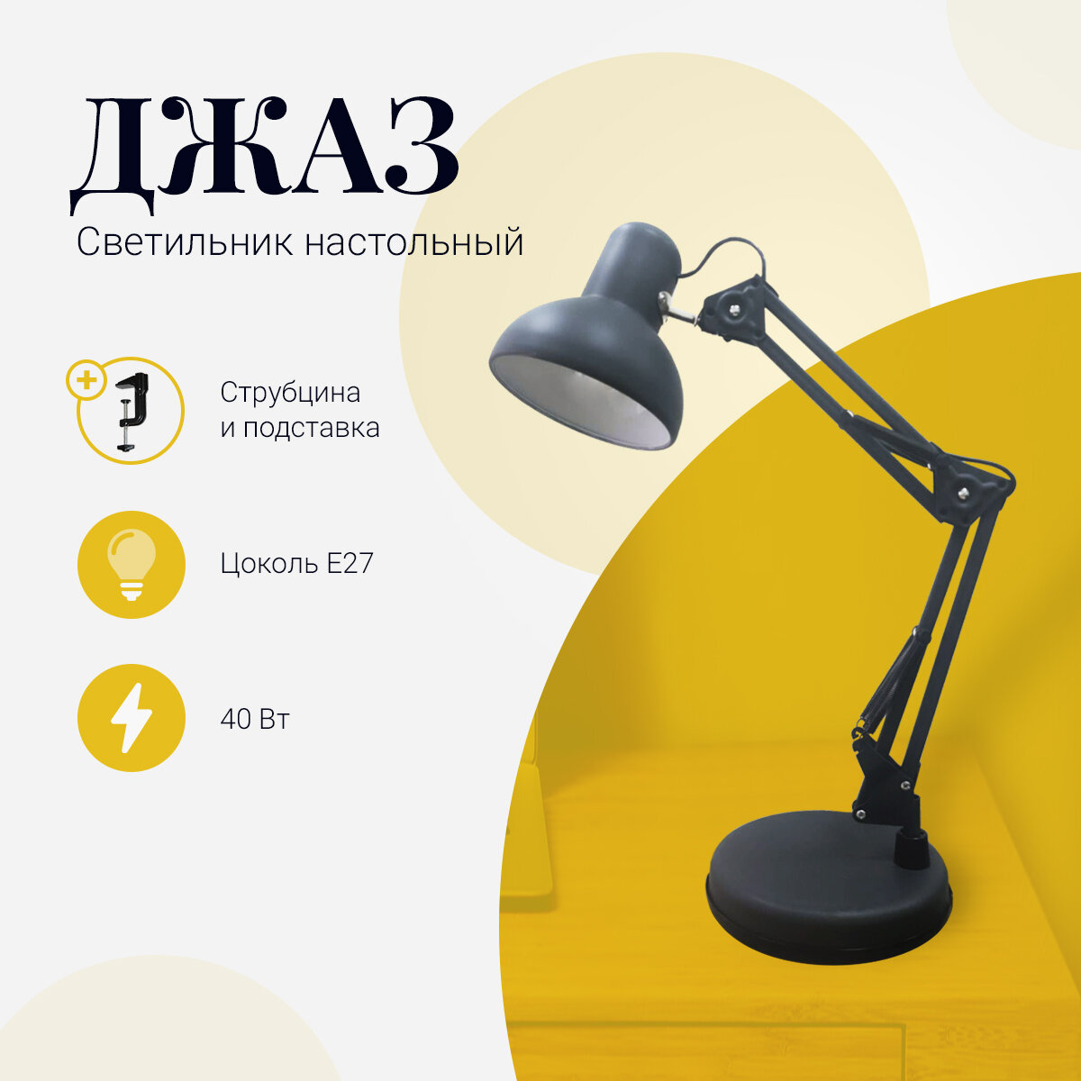 Лампа настольная Трансвит Джаз с подставкой, светильник на струбцине для школы, уроков, офиса, 40 Вт, E27, черный информация:
