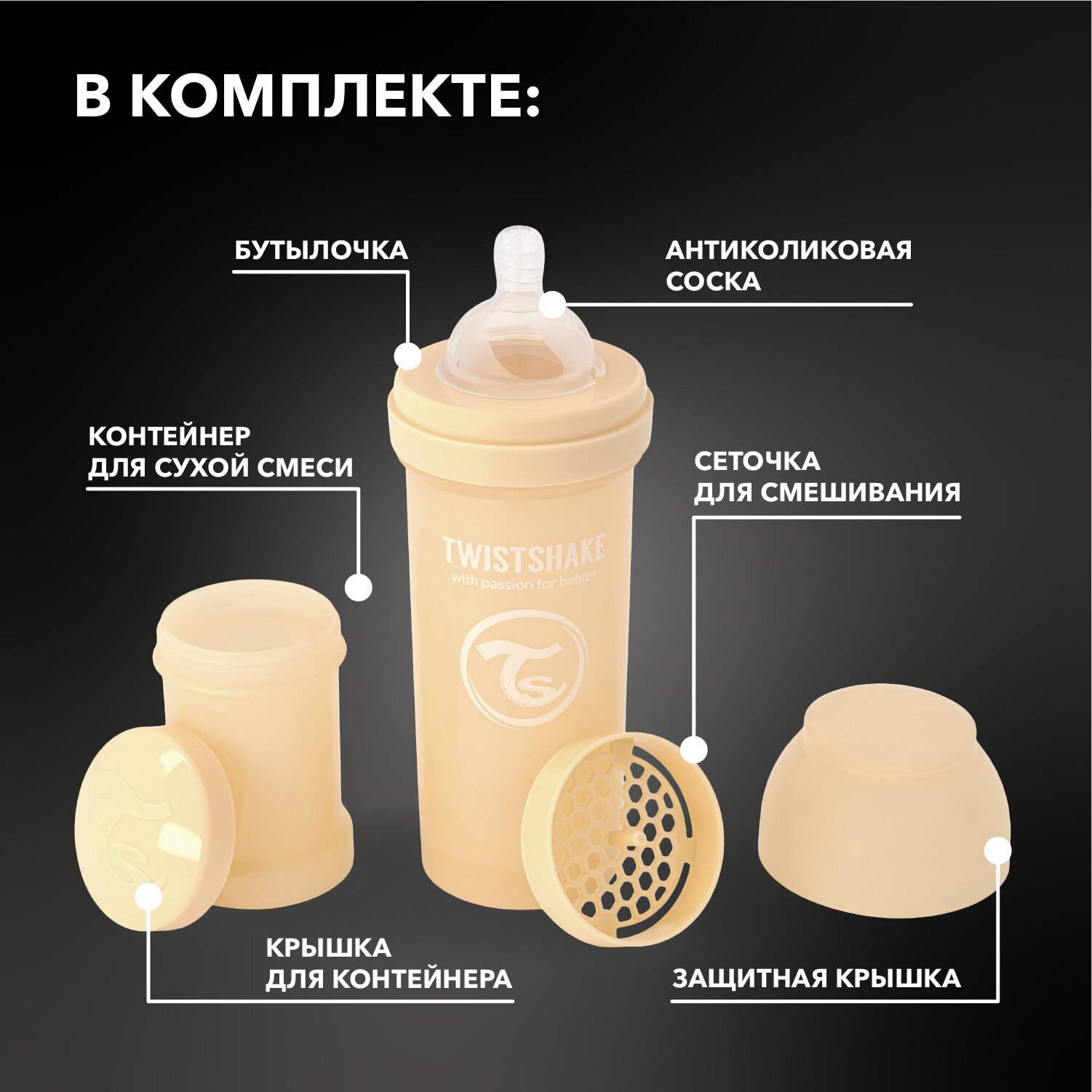 | Комплектация | бутылочка объемом 260 мл с соской, контейнер для хранения сухой смеси объемом 100 мл |