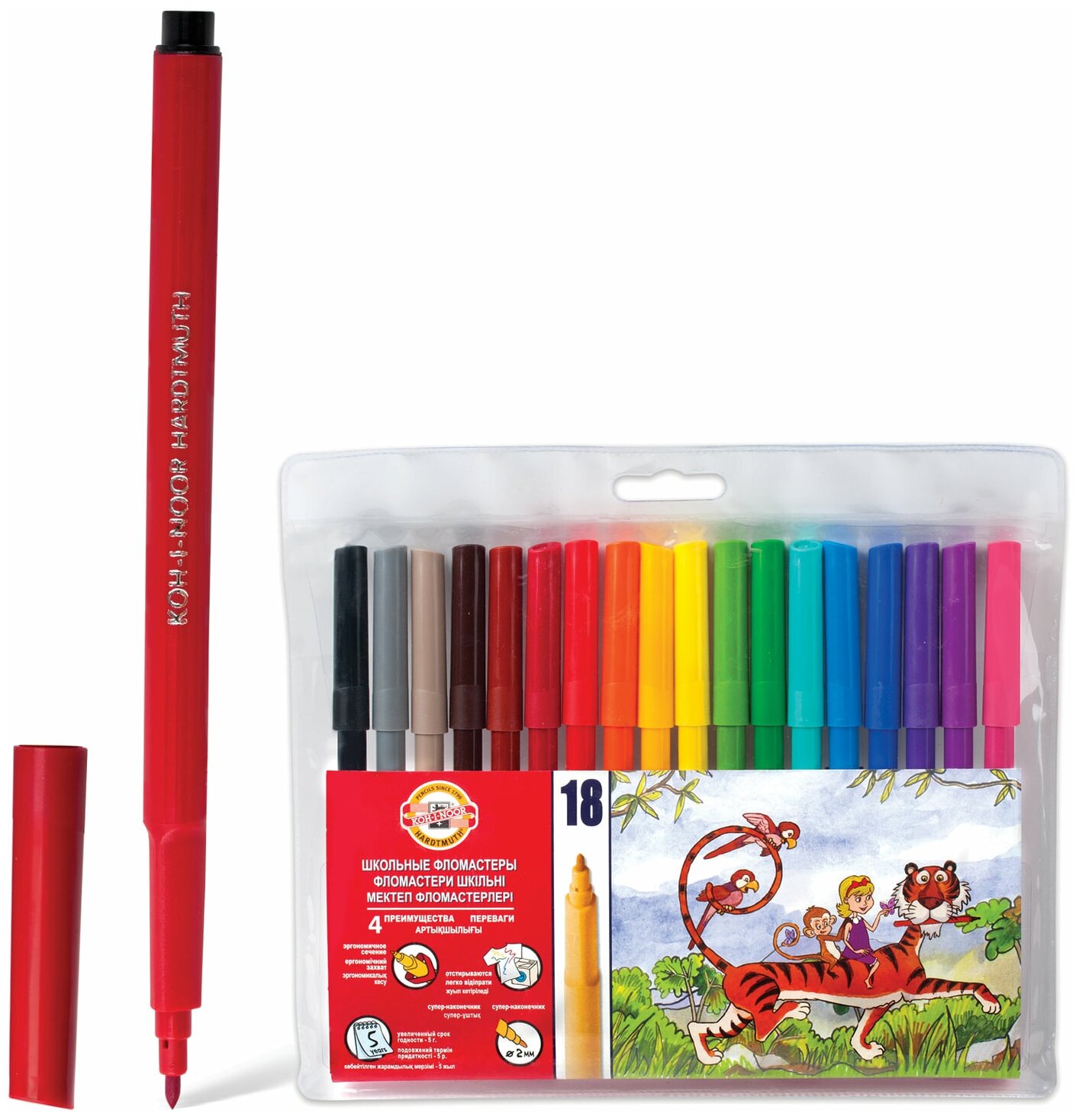 Фломастеры KOH-I-NOOR, 18 цветов, смываемые, трехгранные, пластиковая упаковка, европодвес, 771002AH04TERU В комплекте: 1шт.