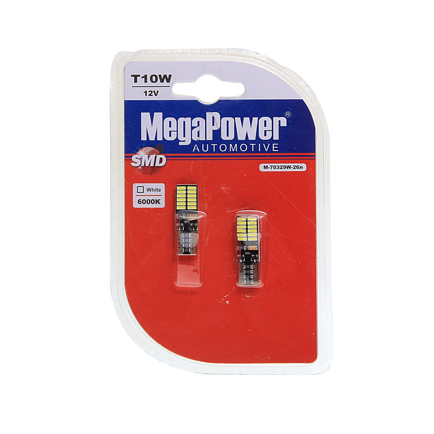 MEGAPOWER-AUTOMOTIVE 70329W-2БЛ Лампа светодиодная 12V W5W T10W W2.1x9.5d 6000K бесцокольная 24 LED блистер (2шт.) MEGAPOWER