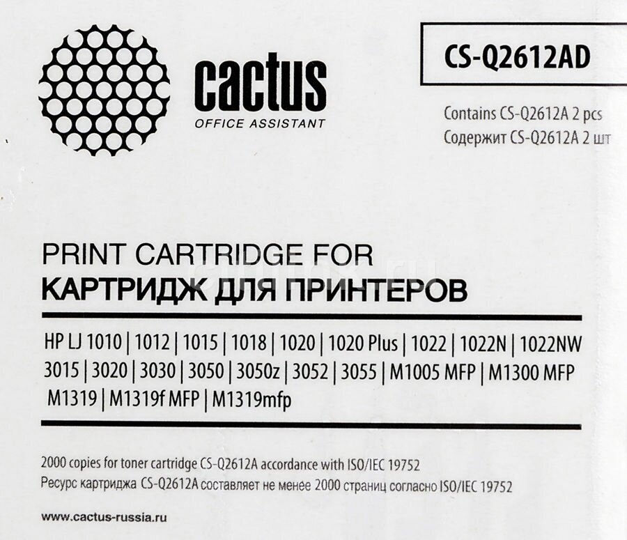 Картридж лазерный Cactus CS-Q2612AD черный x2 упаковки (2000 страниц) для HP 1010/1012/1015/1018/1020/1022/3015/3020