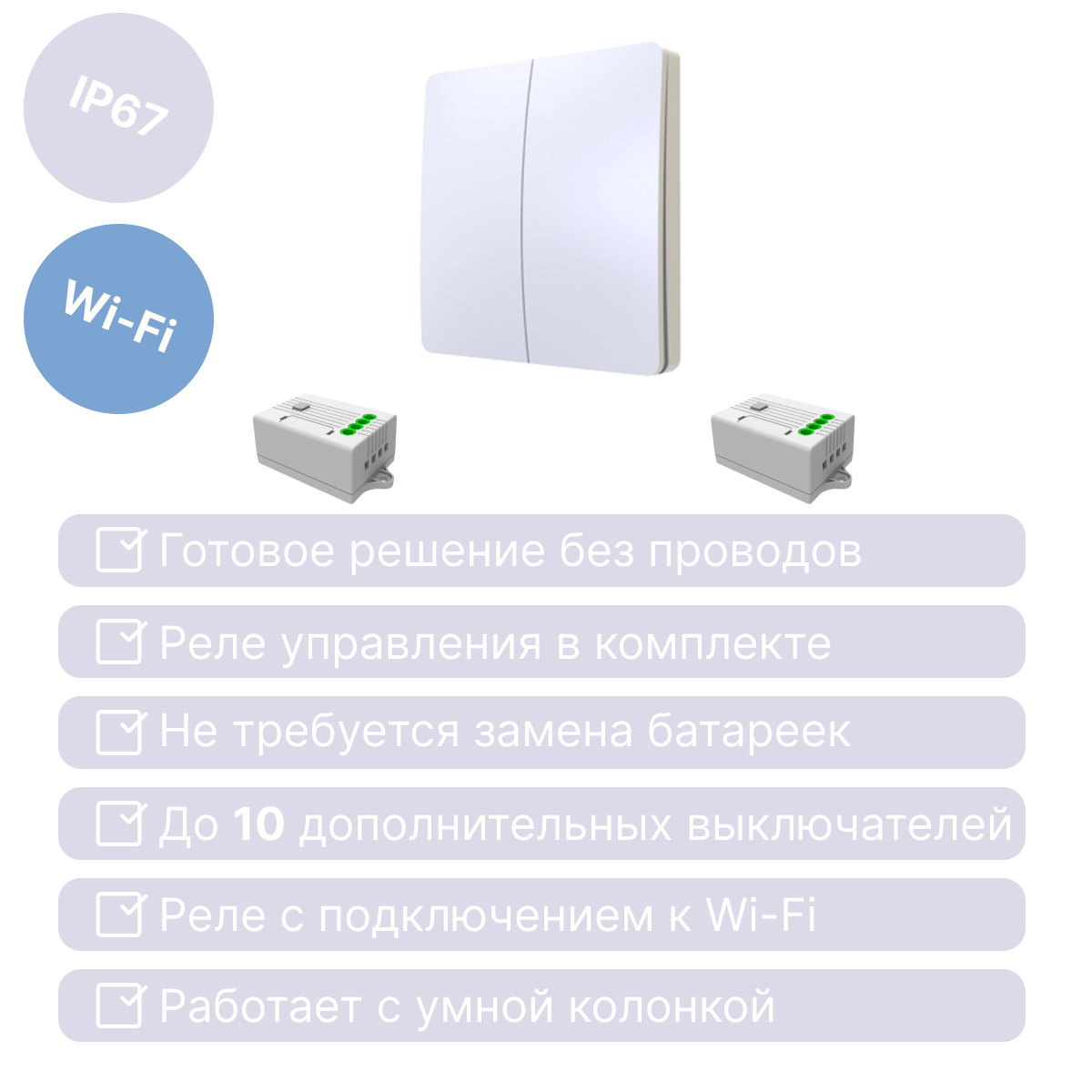 Умный беспроводной выключатель GRITT Evolution 2кл. белый комплект: 1 выкл. IP67, 2 реле 1000Вт 433 + WiFi с управлением со смартфона