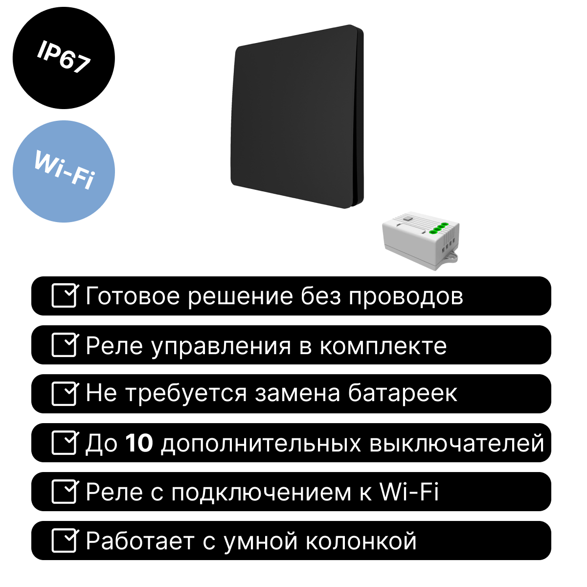 Умный беспроводной выключатель GRITT Space 1кл. черный комплект: 1 выкл. IP67, 1 реле 1000Вт 433 + WiFi с управлением со смартфона, S181110BLWF 6 752 ₽