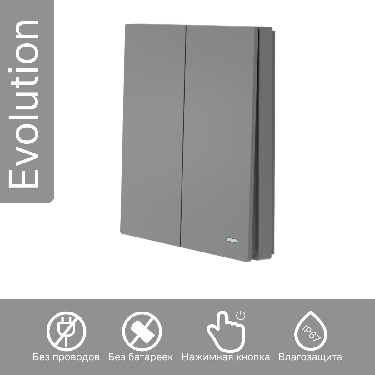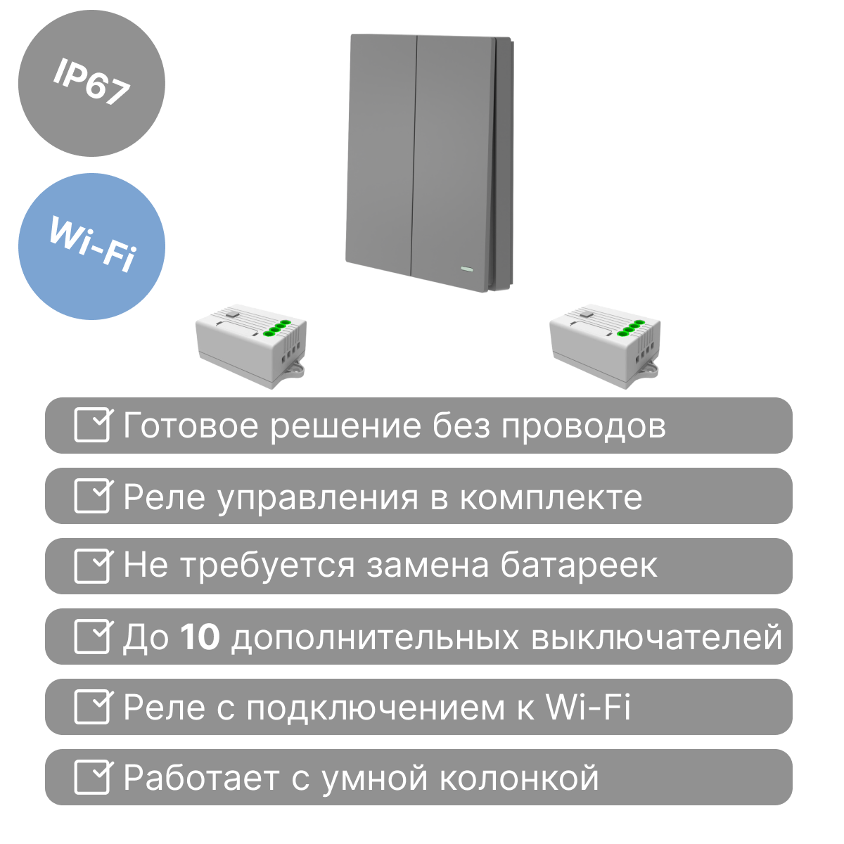 Умный беспроводной выключатель GRITT Evolution 2кл. графит комплект: 1 выкл. IP67, 2 реле 1000Вт 433 + WiFi с управлением со смартфона, EV221220GRWF информация: