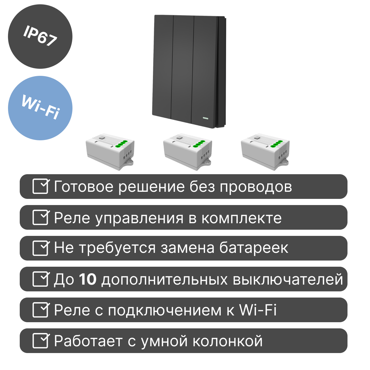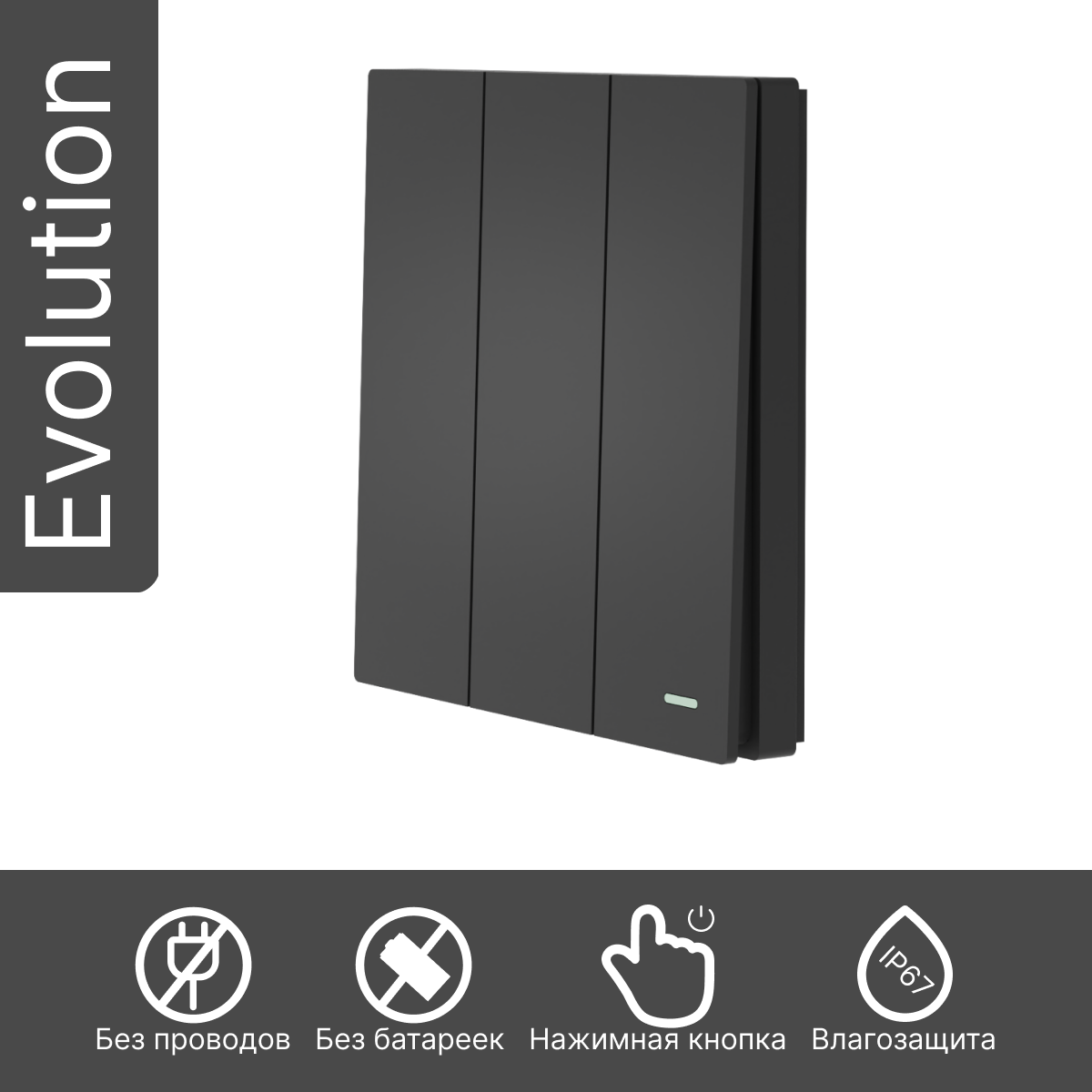 Умный беспроводной выключатель GRITT Evolution 3кл. антрацит комплект: 1 выкл. IP67, 3 реле 1000Вт 433 + WiFi с управлением со смартфона, EV221330BLWF информация: