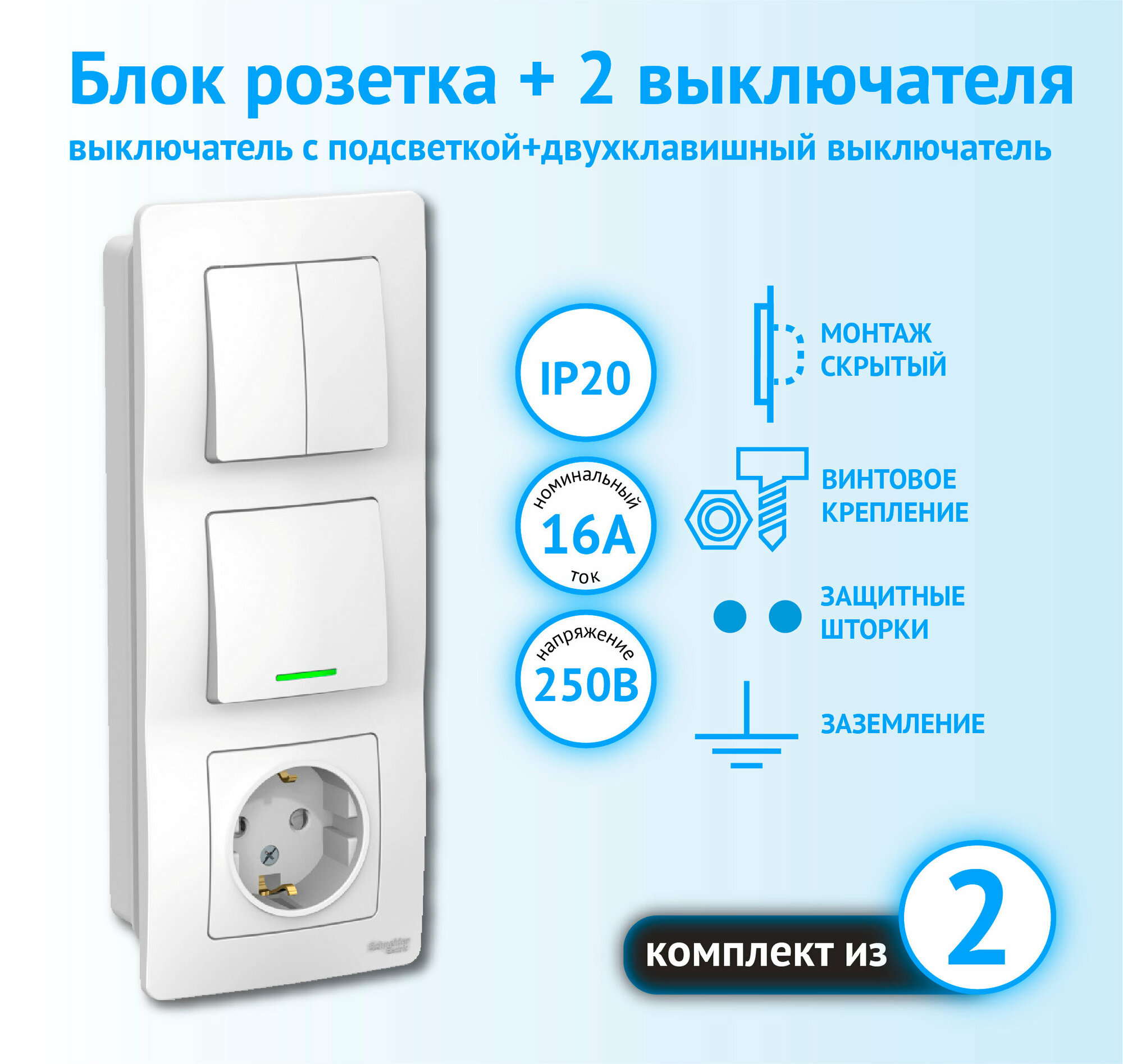 10 цен на Блок Schneider Electric BLANCA BLNBS101211 с индикацией розетка + 2 выключателя белый (комплект из 2 шт)