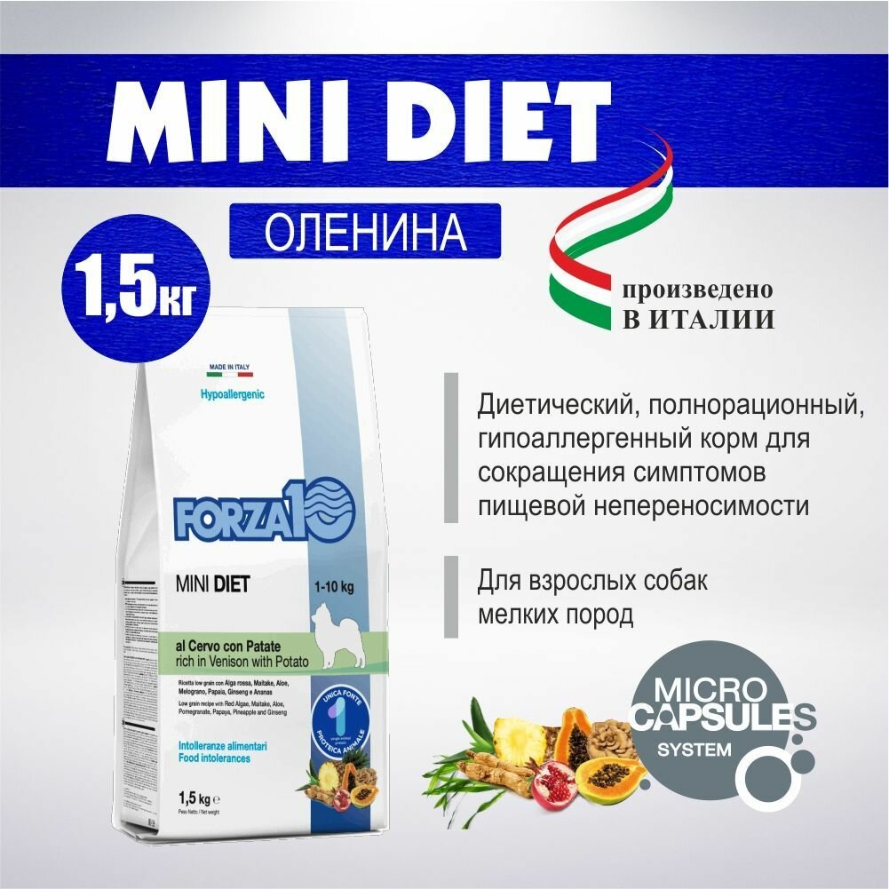 Сухой корм FORZA10 Mini Diet Venison with Patate для взрослых собак мелких пород с олениной и картофелем с микрокапсулами, 1,5 кг информация: