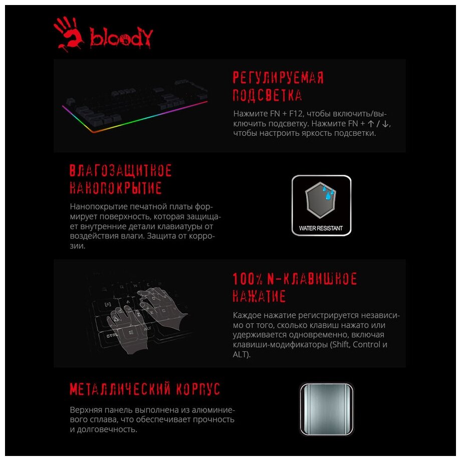 Игровая клавиатура Bloody, черный, кириллица+QWERTY, с подсветкой, мембранная