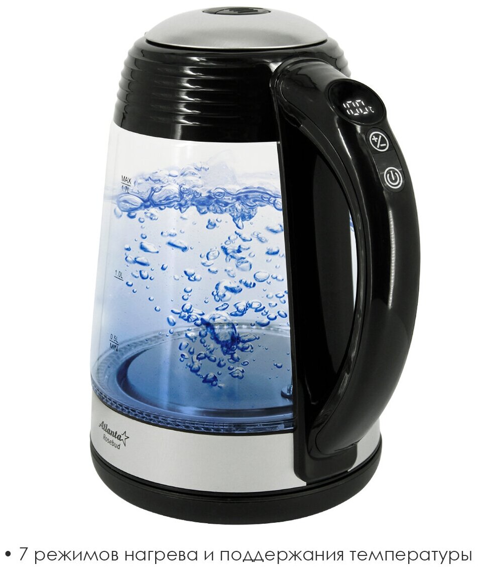 10 цен на Электрический чайник Atlanta ATH-2535 (black) / 1,7 л / стеклянный / с подсветкой разноцветной / с регулировкой температуры / 2200 Вт / черный