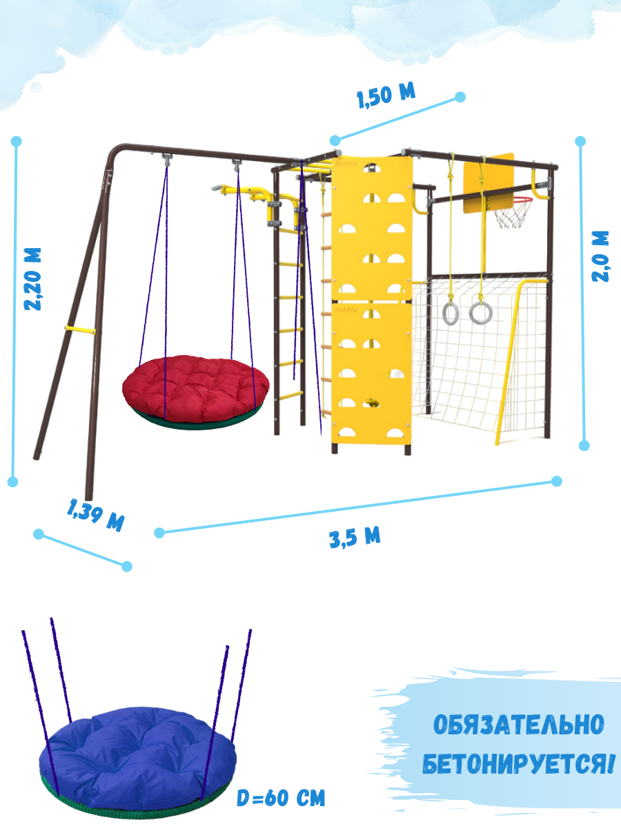 | Комплектация | рукоход, турник, ворота, качели Гнездо на цепях, скалодром, кольцо баскетбольное, кольца гимнастические, канат, лестница веревочная, трапеция, закладные для бетонирования |