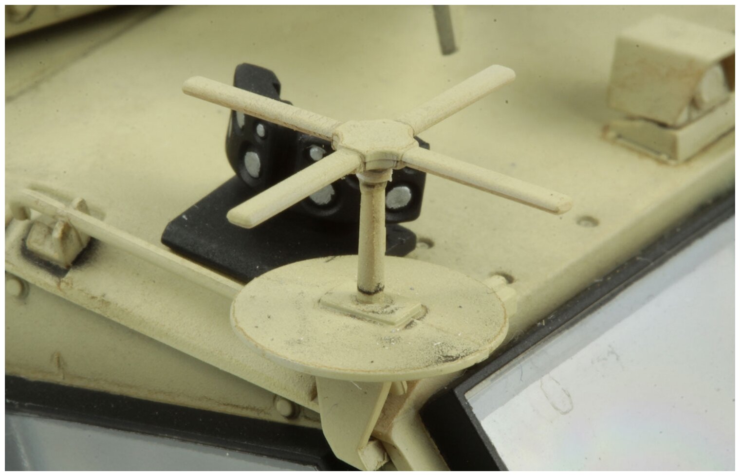 | Дополнительная информация | реалистичная копия; ветровые стекла представлены двухслойными прозрачными деталями; передние колеса поворачиваются, как и оружейная станция на крыше; клей и краски в набор не входят |