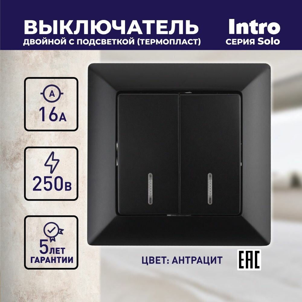 Выключатель Intro Solo 4-105-05 двухклавишный с подсветкой 10А-250В IP20 СУ Solo черный информация: