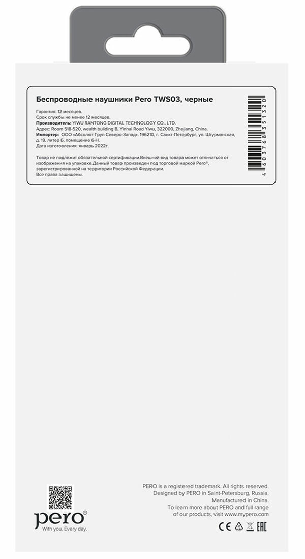 Беспроводные наушники Pero TWS03 COMFORT, черный информация: