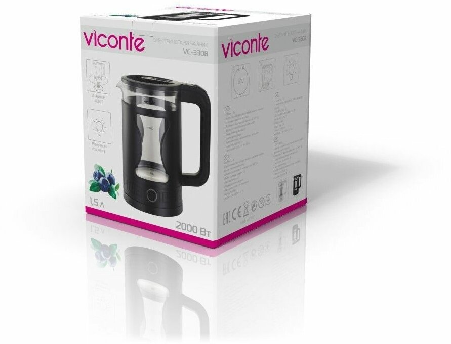 Электрочайник Viconte, 2000 Вт, 1,5 литра, корпус из высококачественного термостойкого стекла и пластика, за VC-3308чёрный