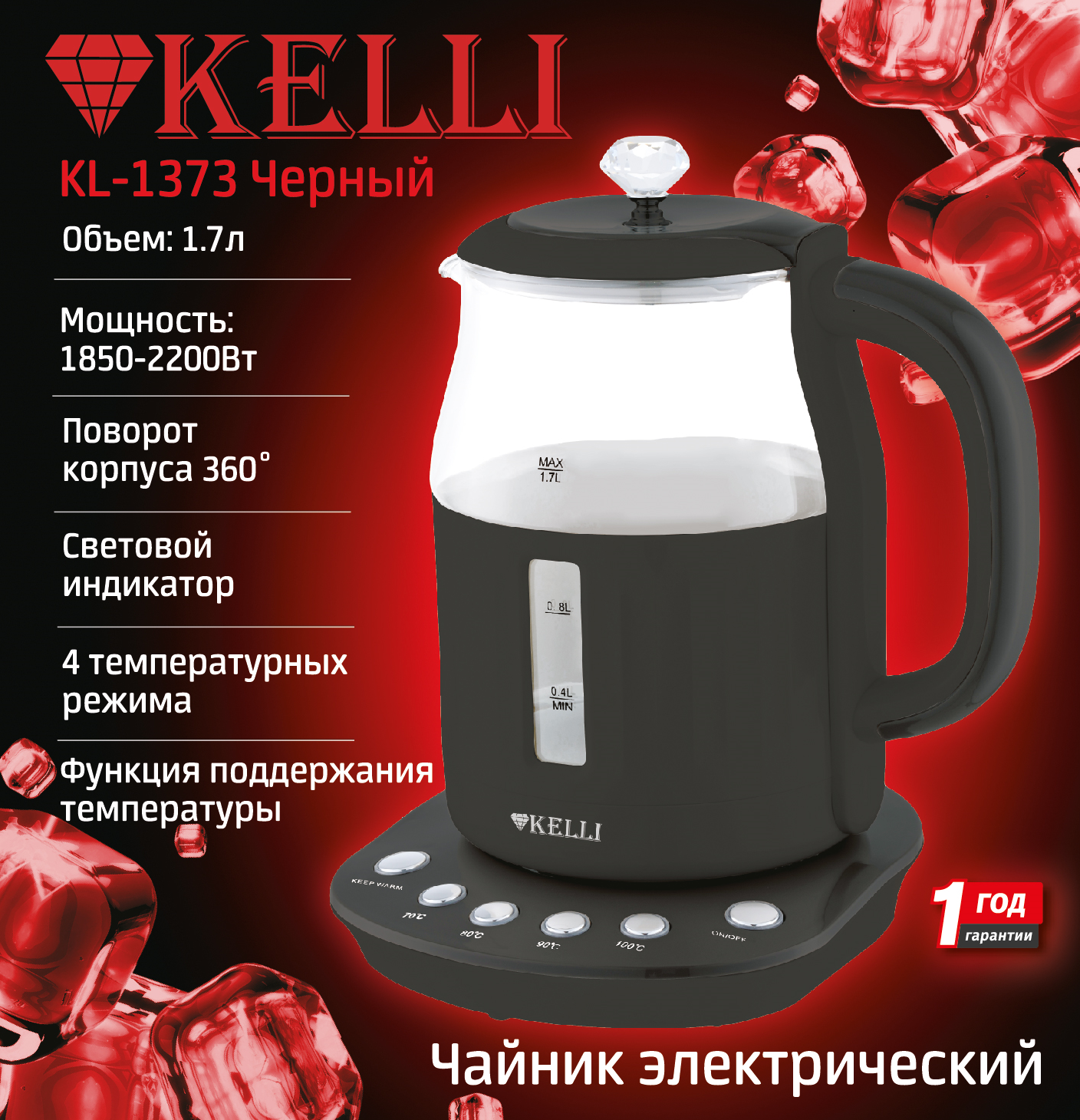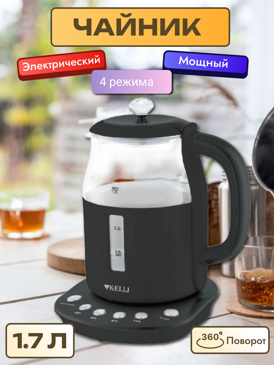 Чайник электрический KELLI KL-1373 1,7 л, чёрный информация: