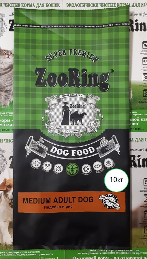 Сухой корм ZooRing для молодых и взрослых собак всех пород MEDIUM ADULT DOG Индейка и рис 1уп. х 10кг. 5 102 ₽