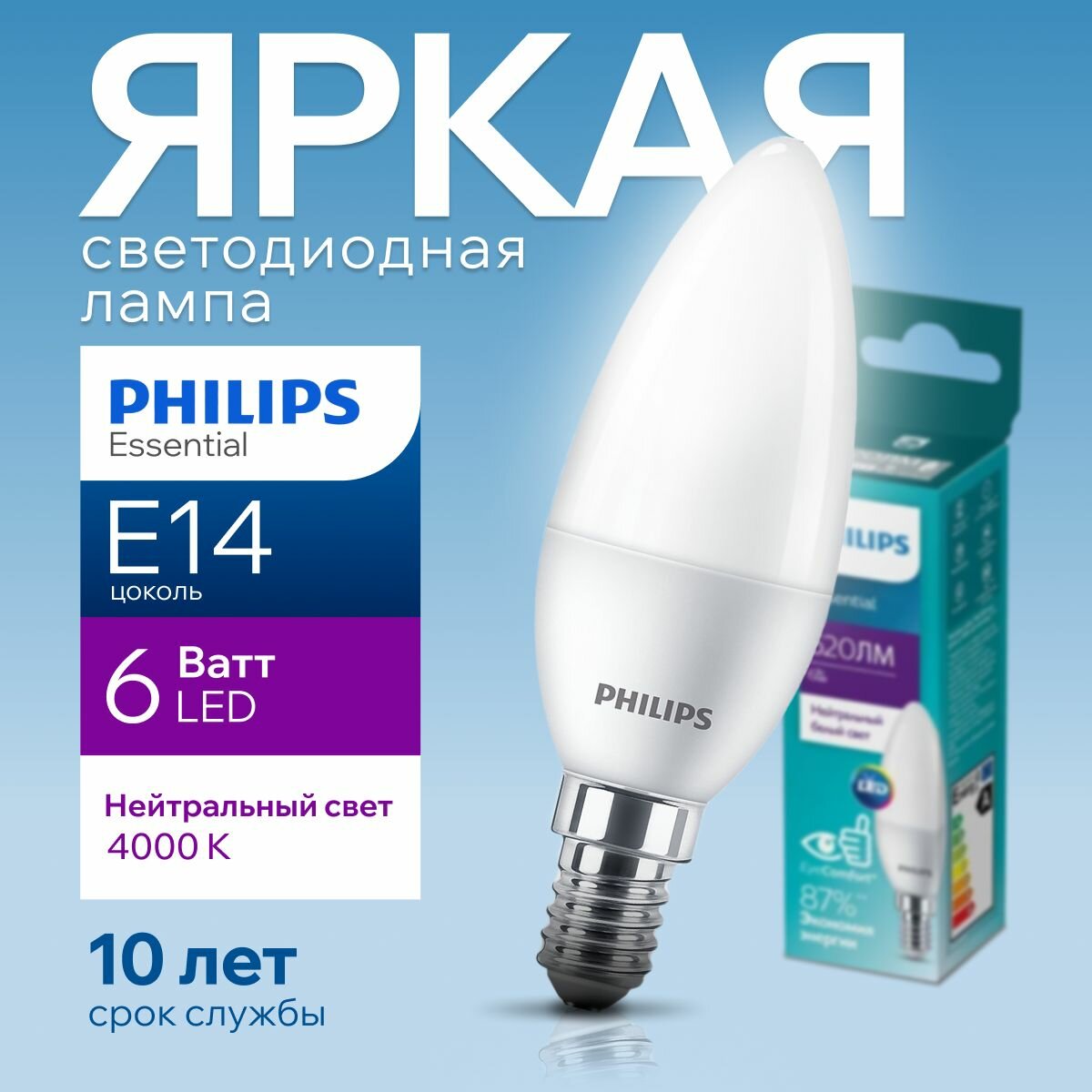 10 цен на Светодиодная лампочка Philips Е14 6 Ватт белый свет, свеча 4000К ESS LEDCandle 840 B38 FR матовая, 6W, E14, 620лм