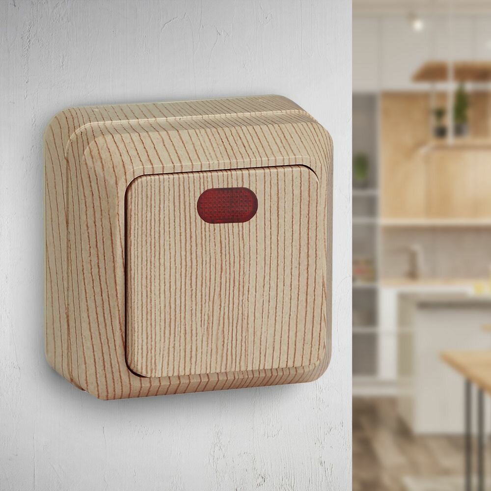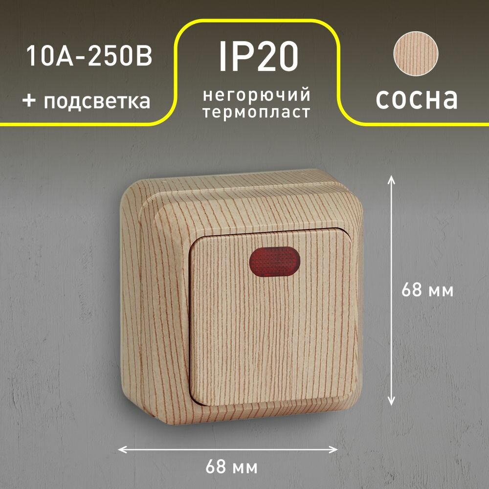 Выключатель одноклавишный Intro Quadro 2-102-11 с подсветкой открытой установки 10А 250В сосна информация: