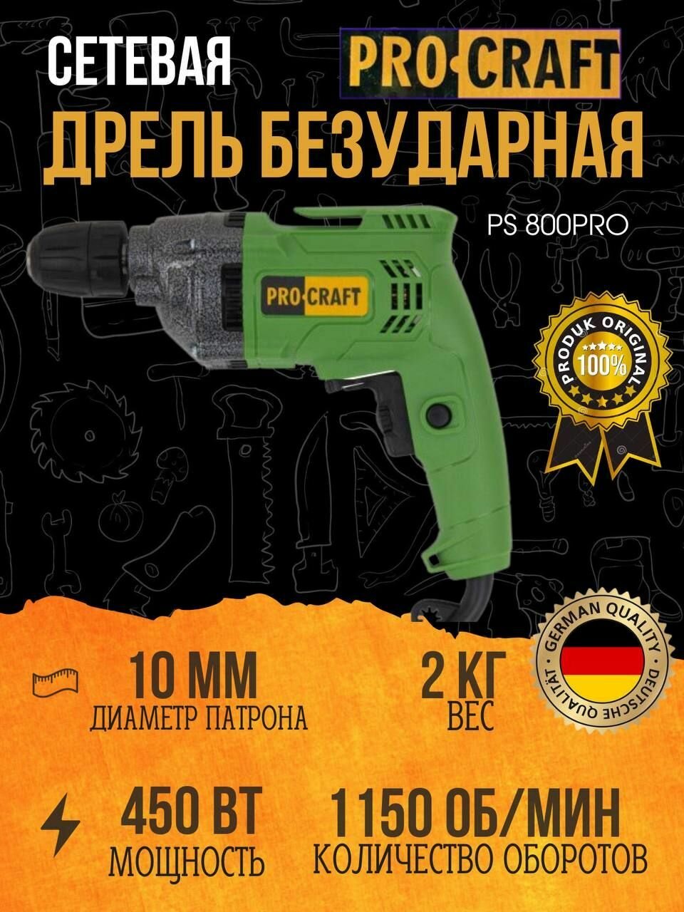 Дрель сетевая безударная Procraft PS-800PRO, 450 Вт, 1500об/мин, патрон 10мм информация: