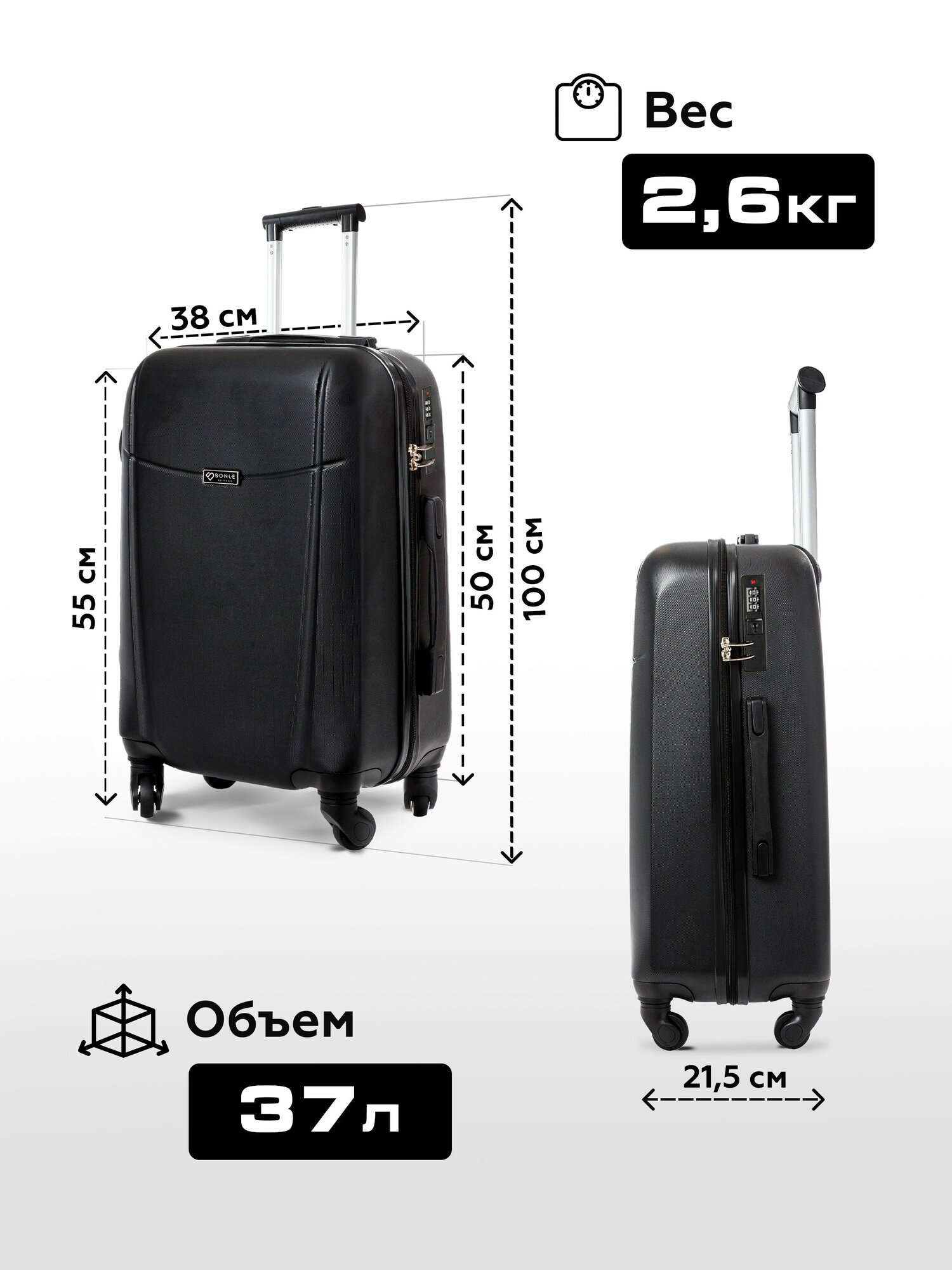 Отзывы на Чемодан на колесах ручная кладь черный Bonle, премиум ABS-пластик, размер S, 55 см, 37 л, дорожный, маленький, детский
