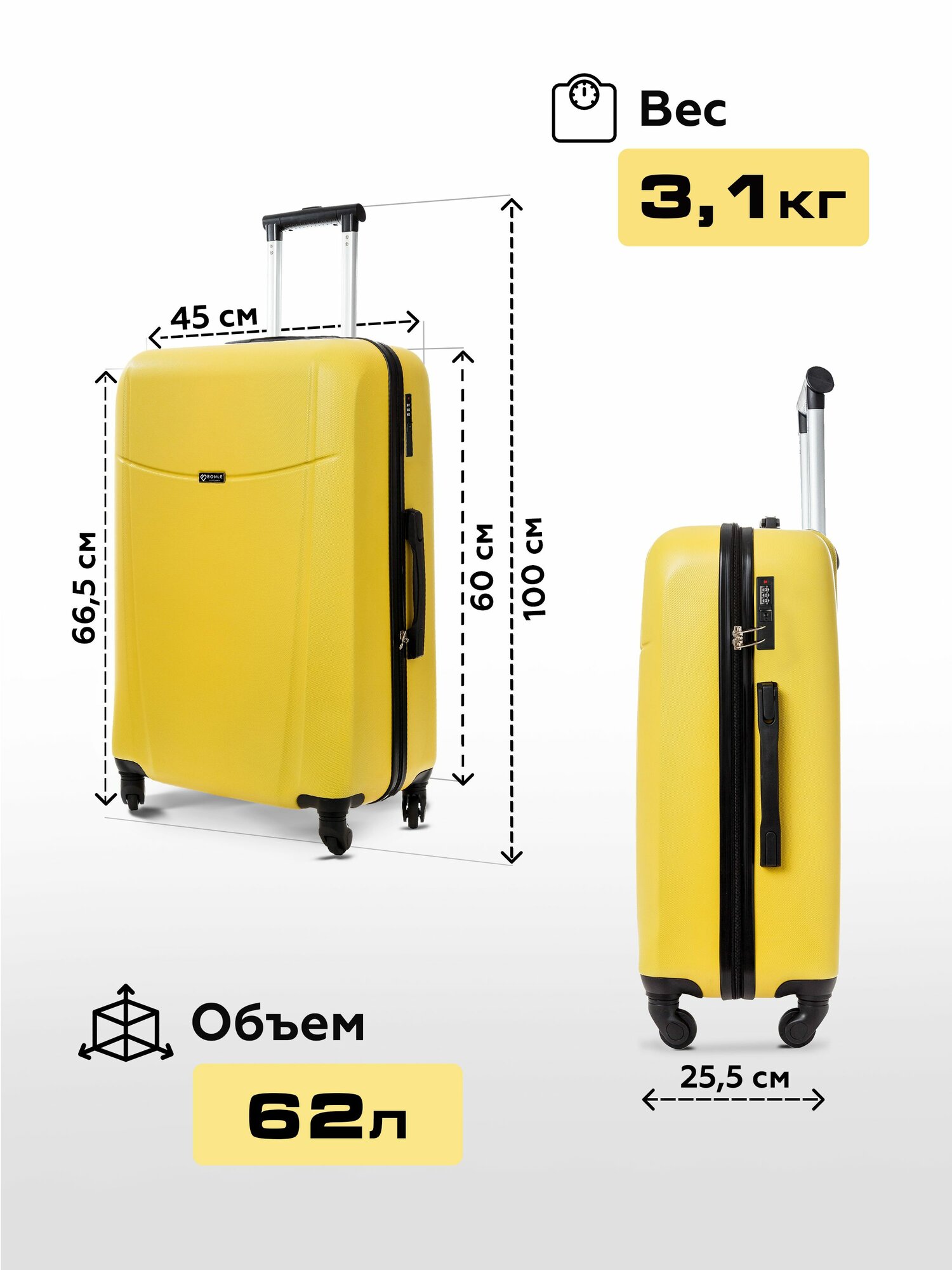 Чемодан на колесах M желтый Bonle, премиум ABS-пластик 66,5 см, 62 л, средний дорожный информация: