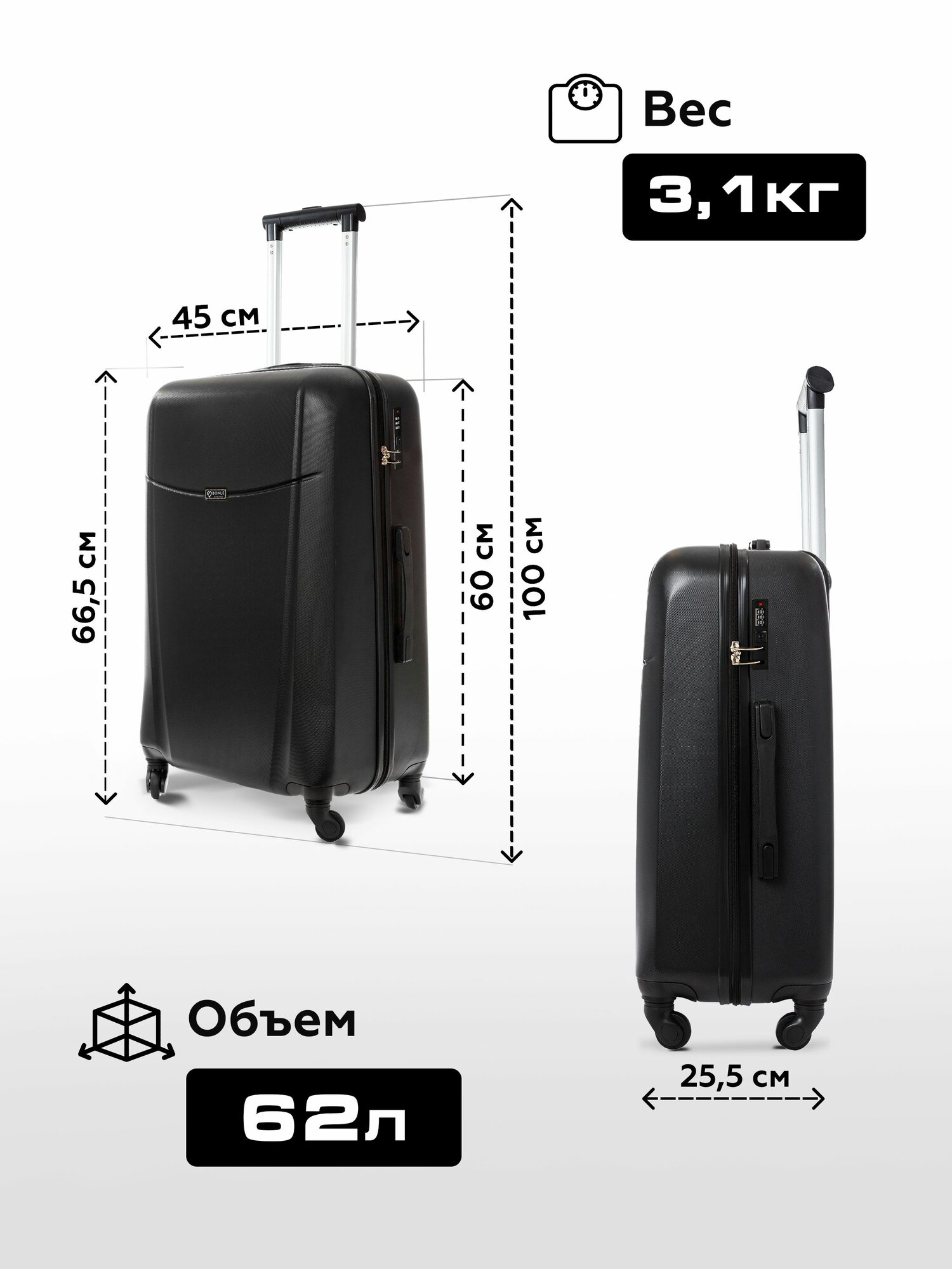 Чемодан на колесах M черный Bonle, премиум ABS-пластик 66,5 см, 62 л, средний дорожный информация: