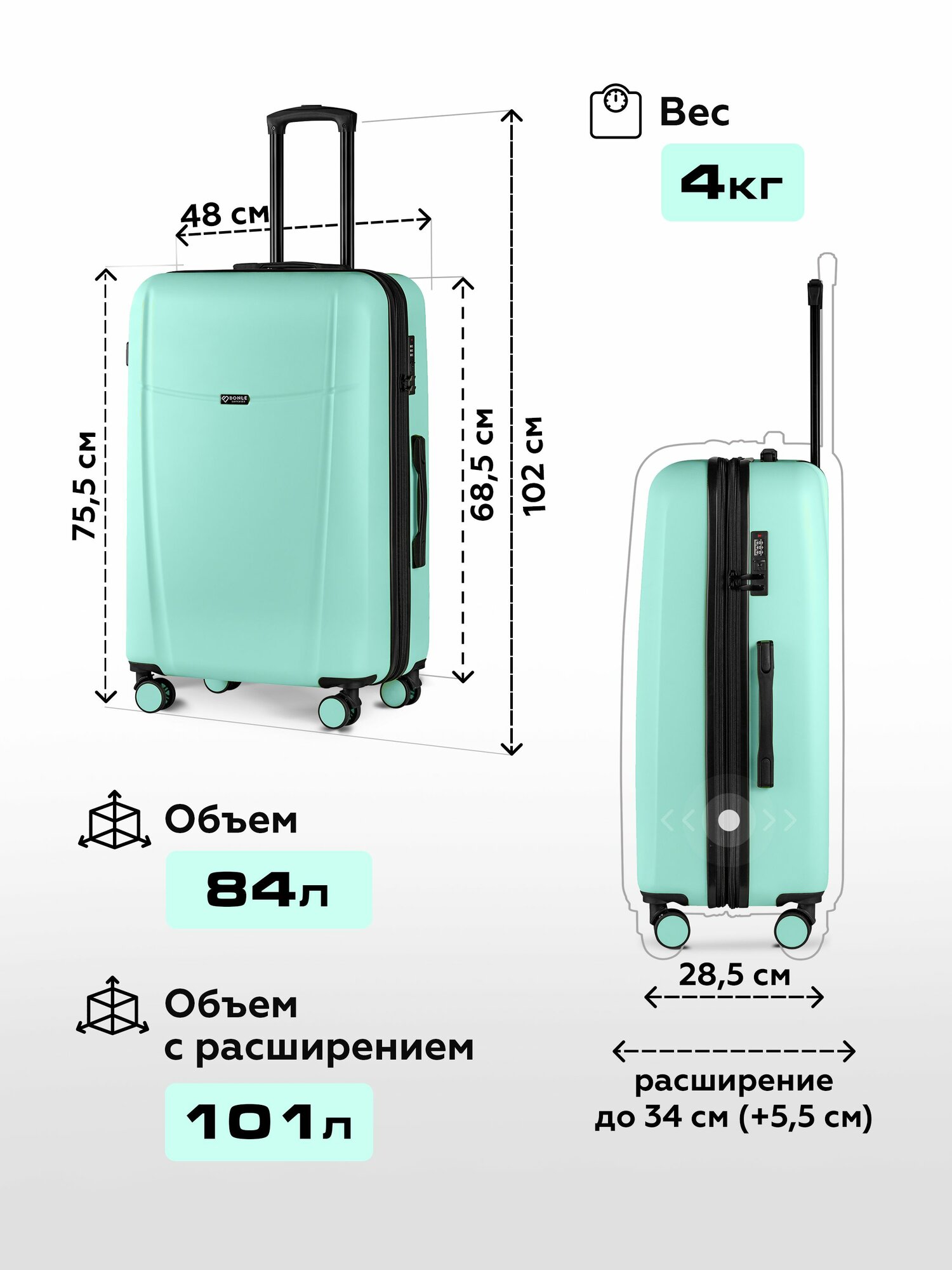 Чемодан на колесах L мятный Bonle, премиум ABS-пластик 75,5 см, 101 л, большой дорожный 7 980 ₽