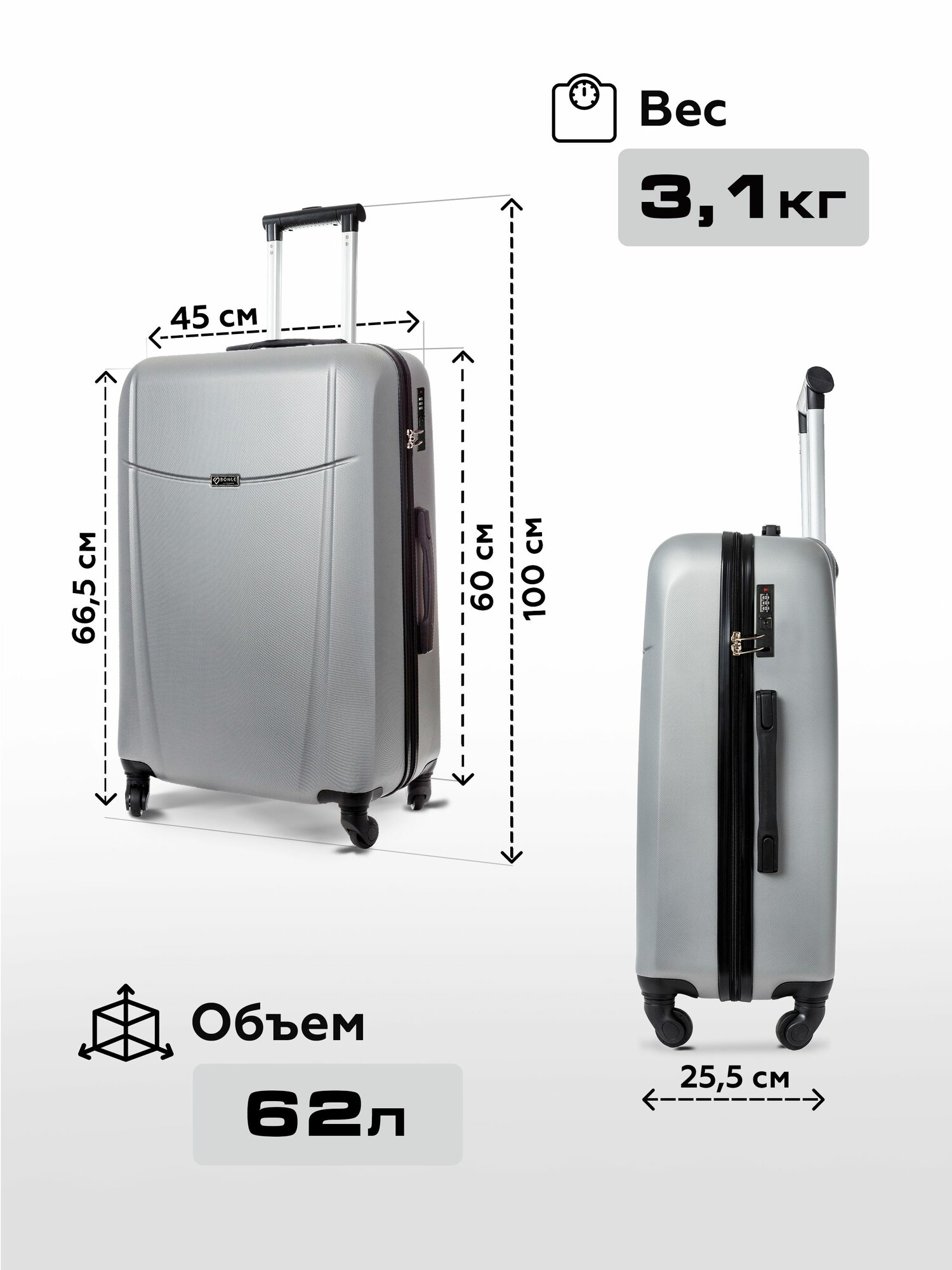 Чемодан на колесах M серебряный Bonle, премиум ABS-пластик 65 см, 62 л, средний дорожный информация: