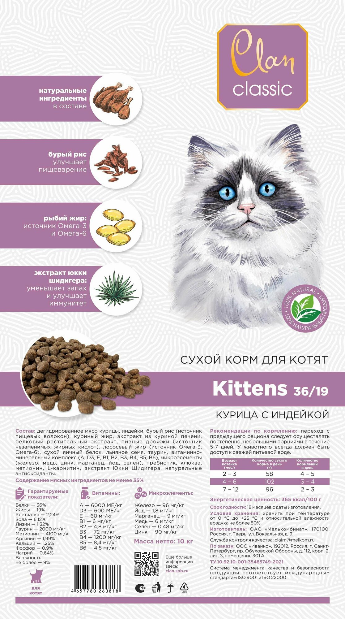 CLAN CLASSIC Kittens 36/19 Сухой корм для котят, курица с индейкой, 10 кг