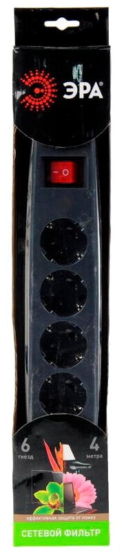 SF-6es-4m-B Сет.фильтр ЭРА (черный) с заземл, 3x0,75мм2, со шт, с выкл, 6гн, 4м, кор (20/360) информация: