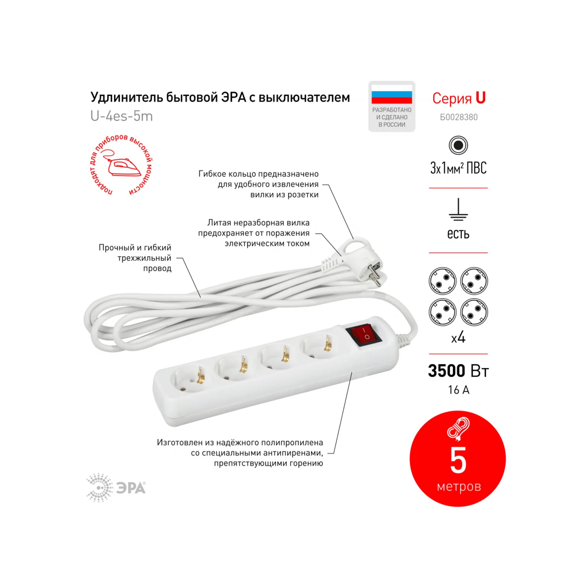 ЭРА сет. удл. ПВС 3х1 4 роз. 5 м 16А/3500Вт земля, выкл (корпус негорючий PP) U-4es-5m (РФ) 37 (арт. 650627)