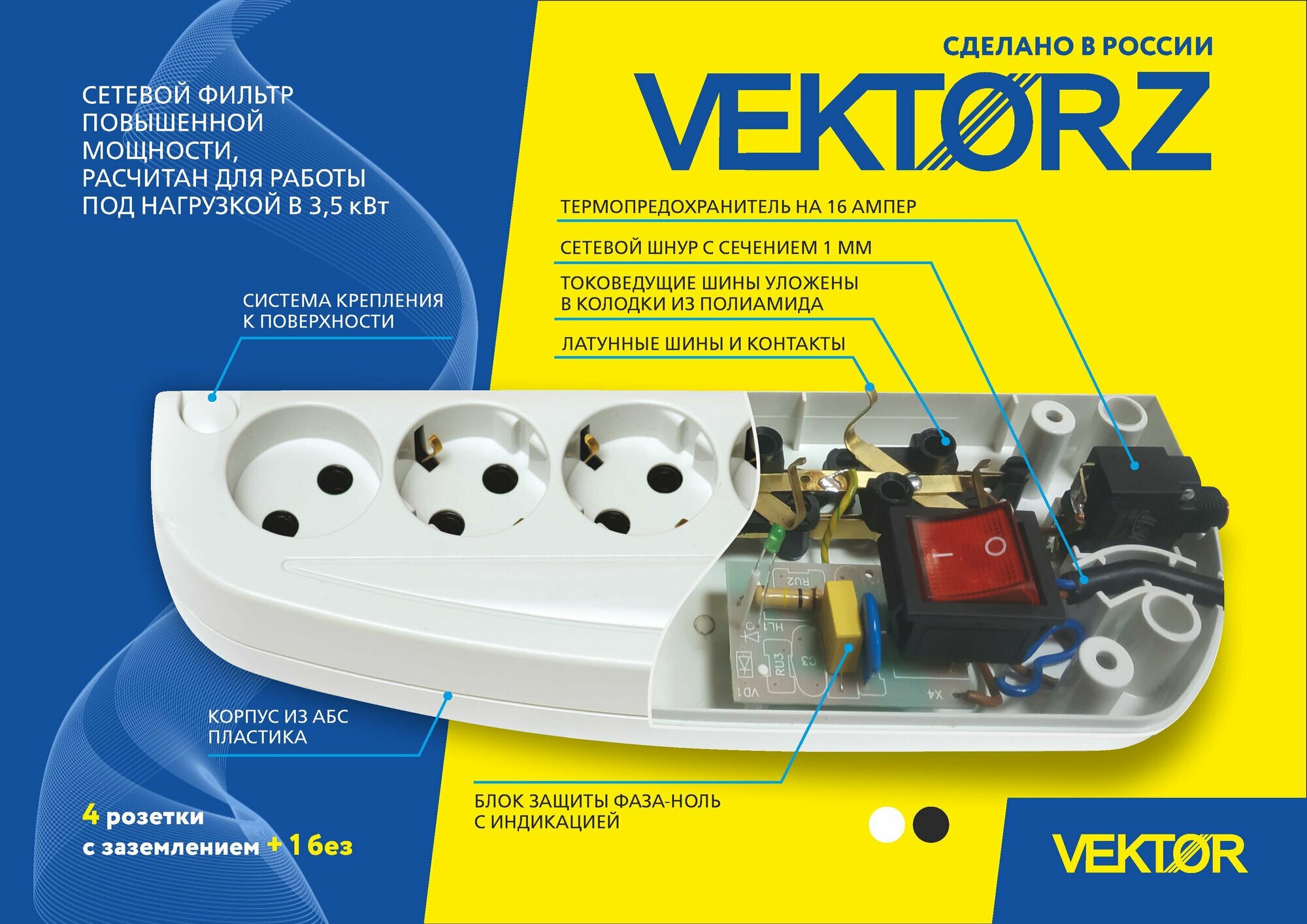 10 цен на Фильтр сетевой Vektor Z, 4 роз. c/з, 1 роз б/з, 3,0м (3,5кВт, 16А), черный